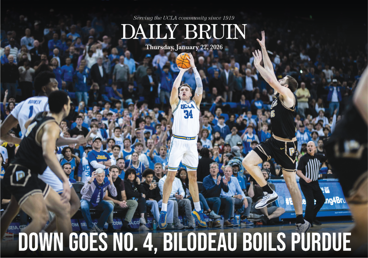 Senior forward Tyler Bilodeau elevates and shoots the ball from beyond the arc. Bilodeau’s shot clinched UCLA’s 69-67 victory against Purdue. The Kennewick, Washington, shot 50% from the 3-point line Tuesday night. (Aidan Sun/assistant Photo editor)