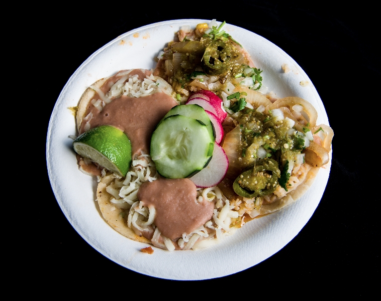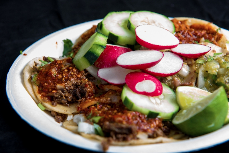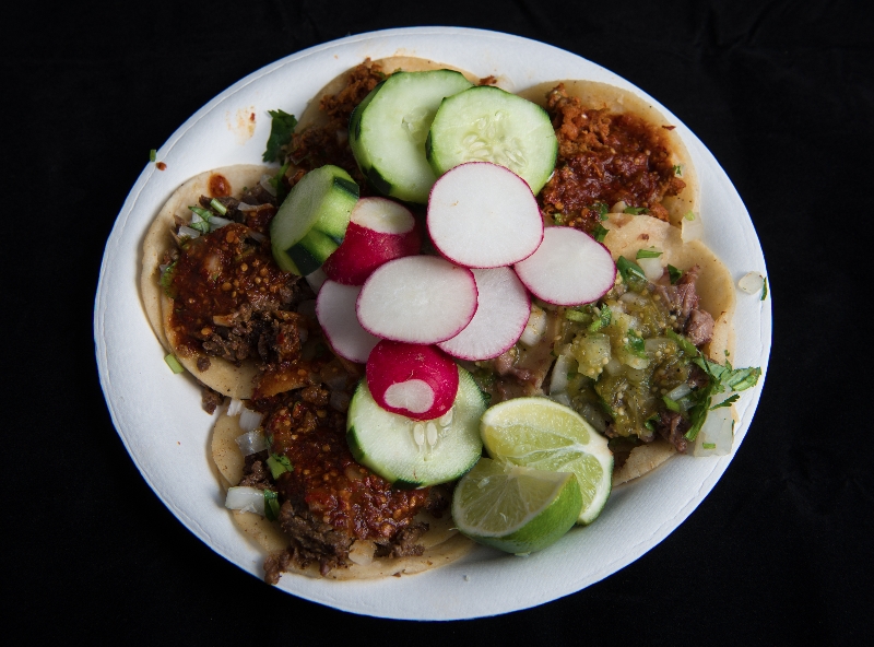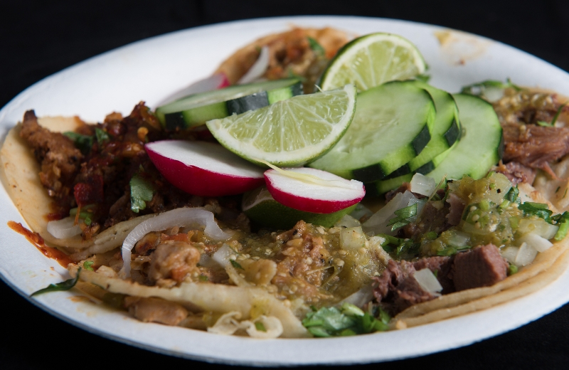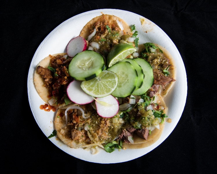 An aerial view of the first plate (CW from bottom: asada, al pastor, lengua)