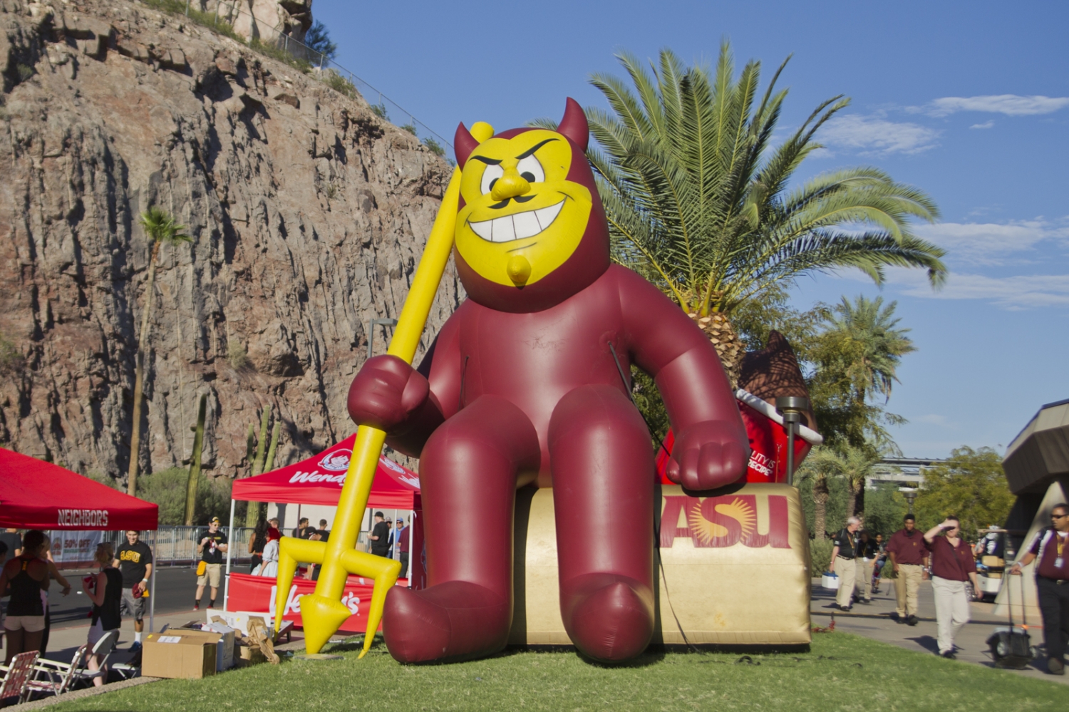 A large blow up of ASU's mascot, Sparky stands guard outside of the stadium.