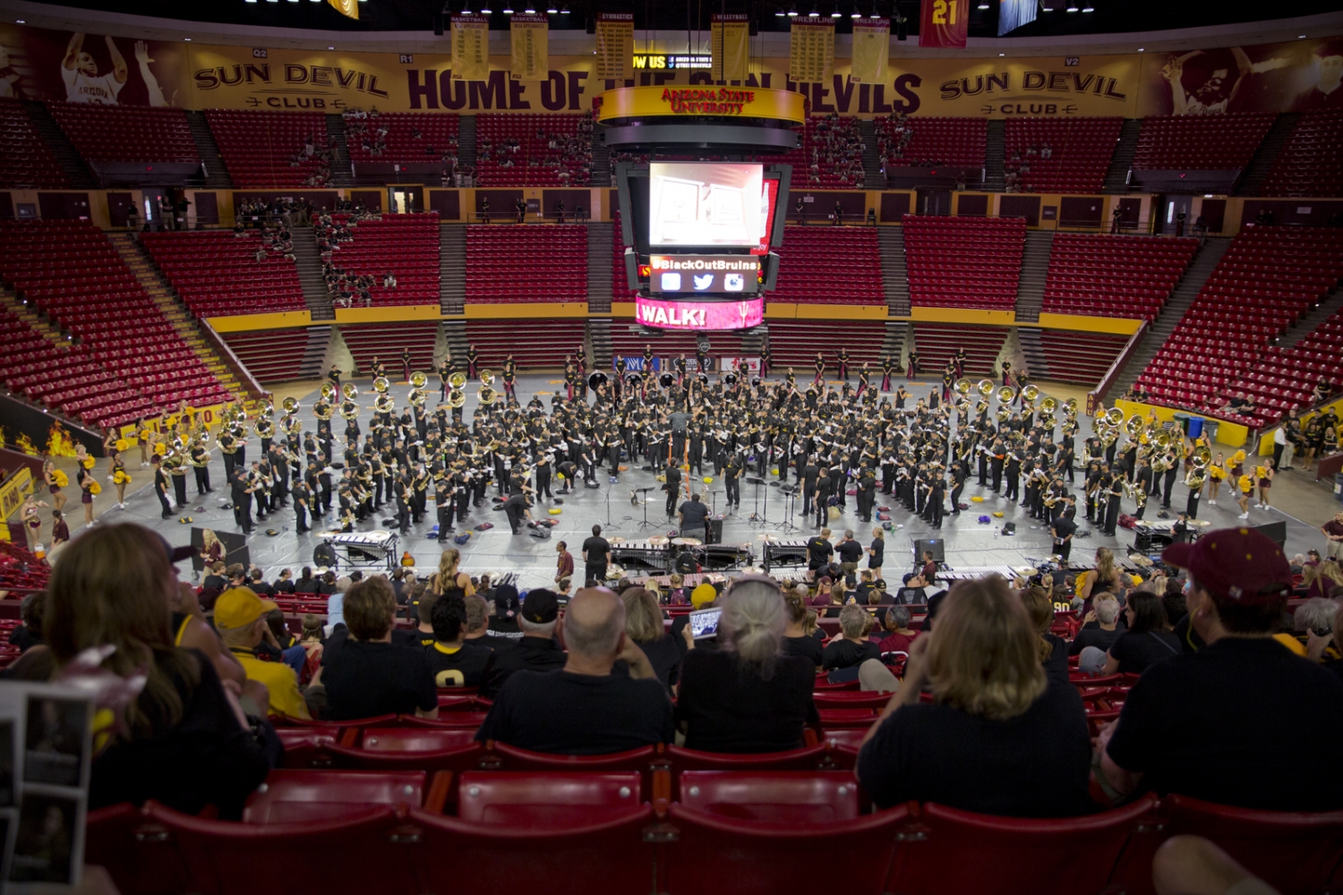 ASU fans listen to the school's marching band perform in the basketball arena.