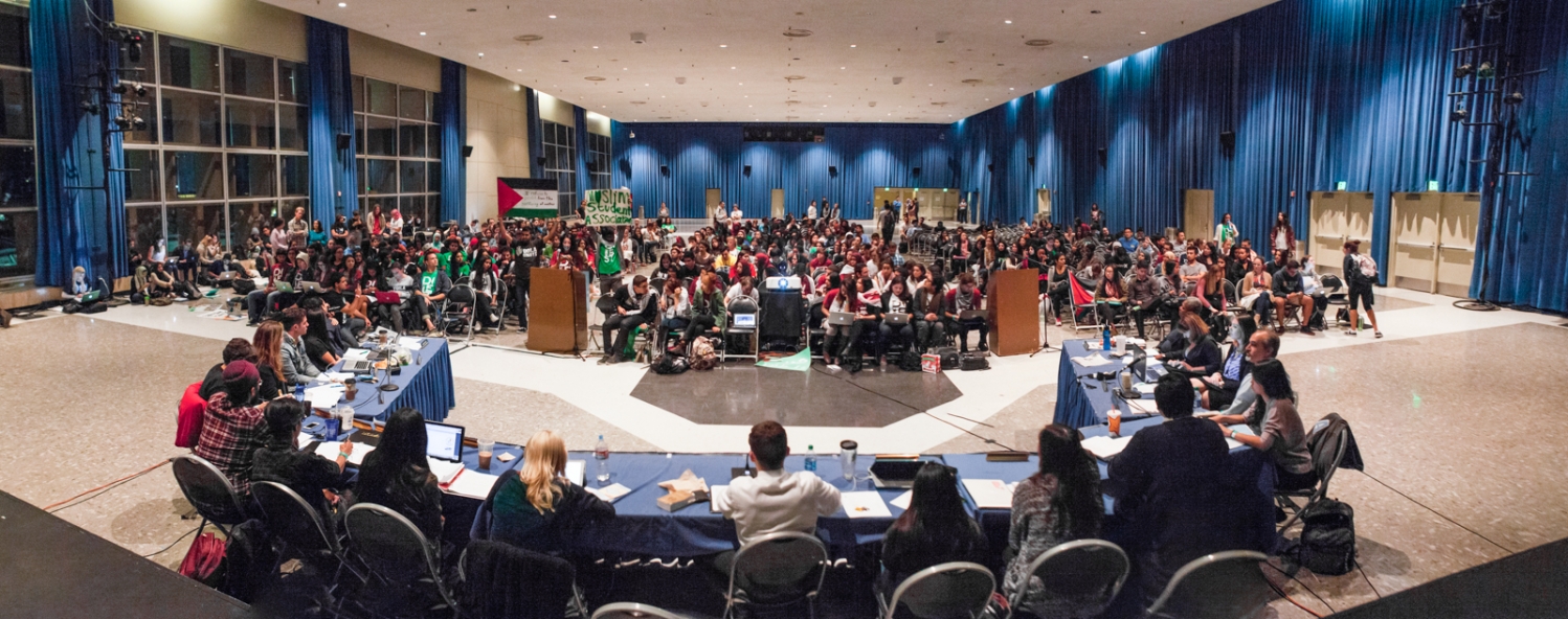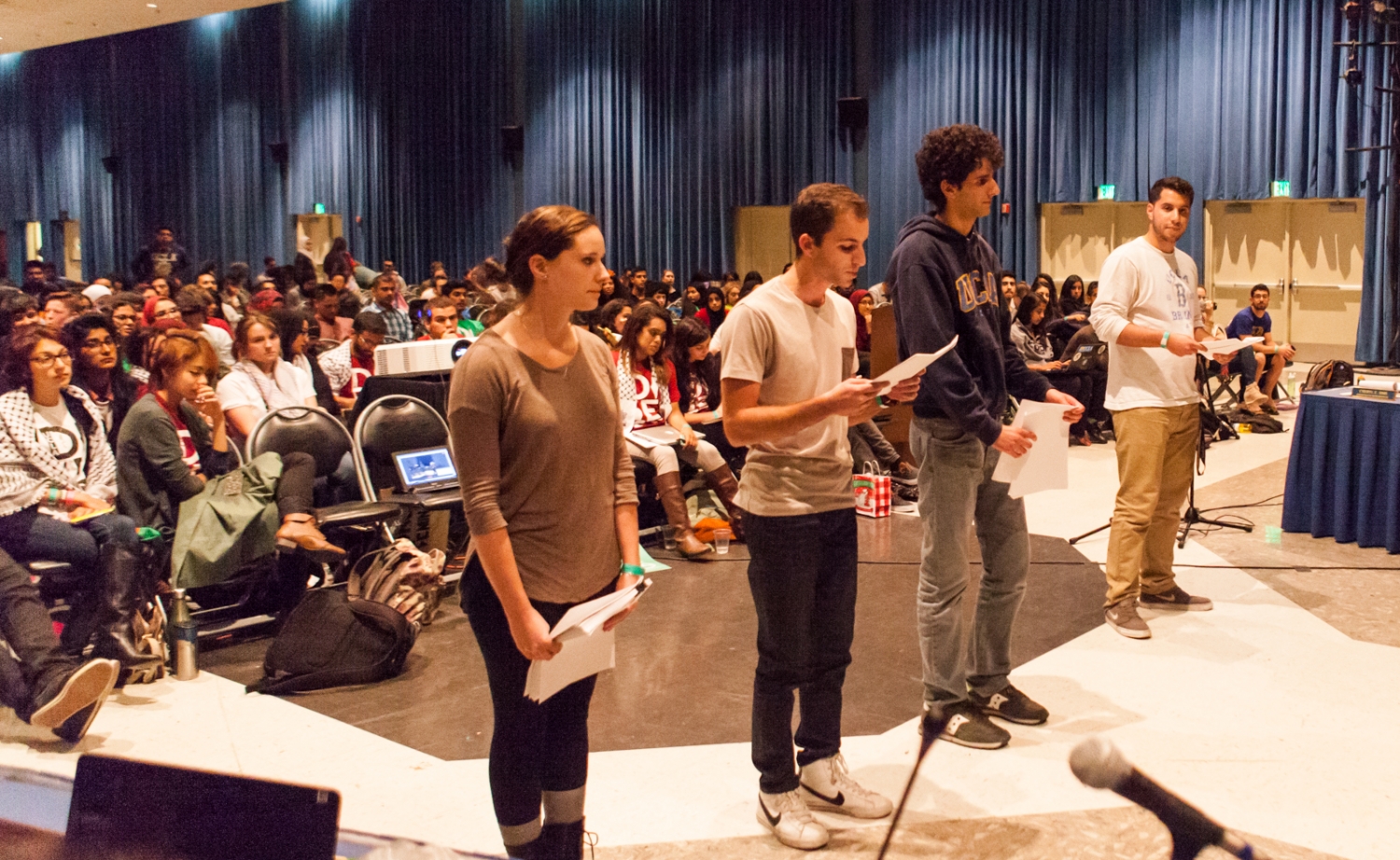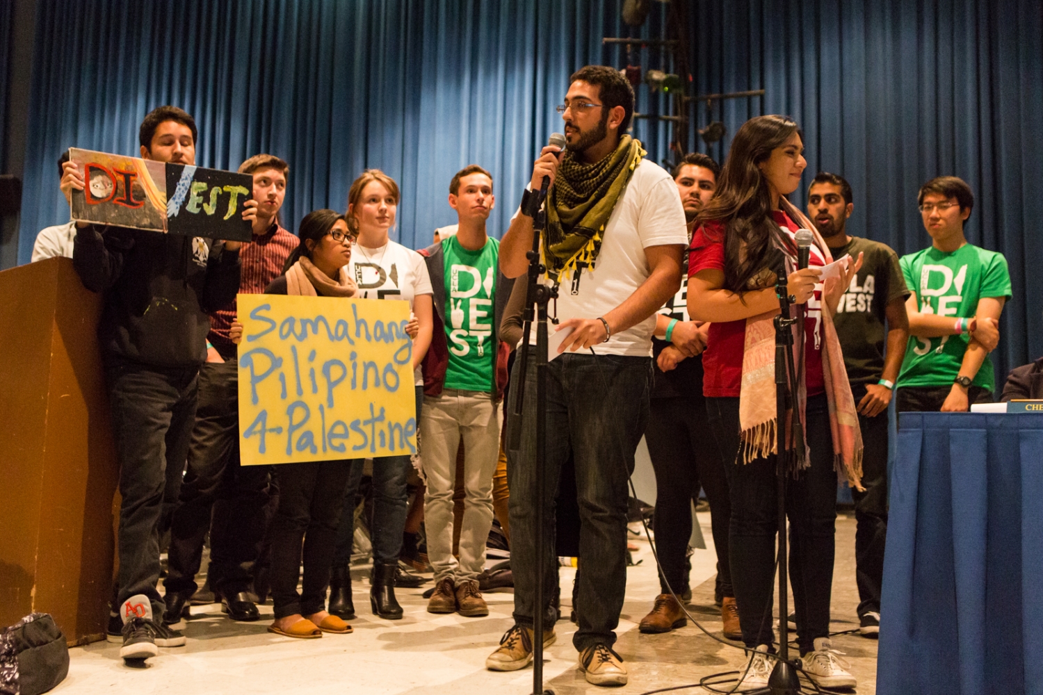 Zawar Jafri, a member of the Muslim Student Association at UCLA, urge Undergraduate Students Association Council members to vote in favor of the resolution Tuesday night. The fifth-year political science student was one of tens of students who gave public comments to USAC.