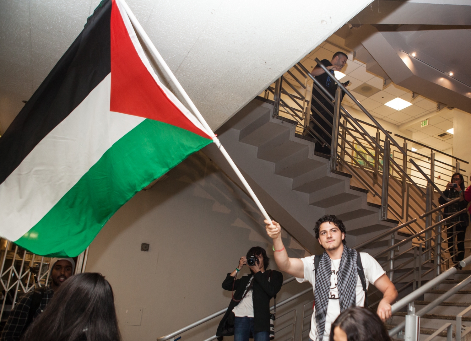 Osama Al-Khawaja, a third-year computer science student at San Diego State University, waved a Palestinian flag after the vote to celebrate.