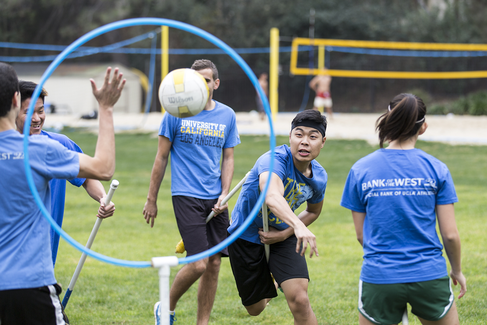 Third-year political science student Tam Tran played the role of Chaser for the team Chickens and Quaffles, scoring 10 points by throwing the Quaffle through one of three hoops set up in the Sunset Canyon Recreation Center Saturday. The Quidditch event, featuring teams from several UCLA residential communities, marked the last day of Harry Potter Week on the Hill.
