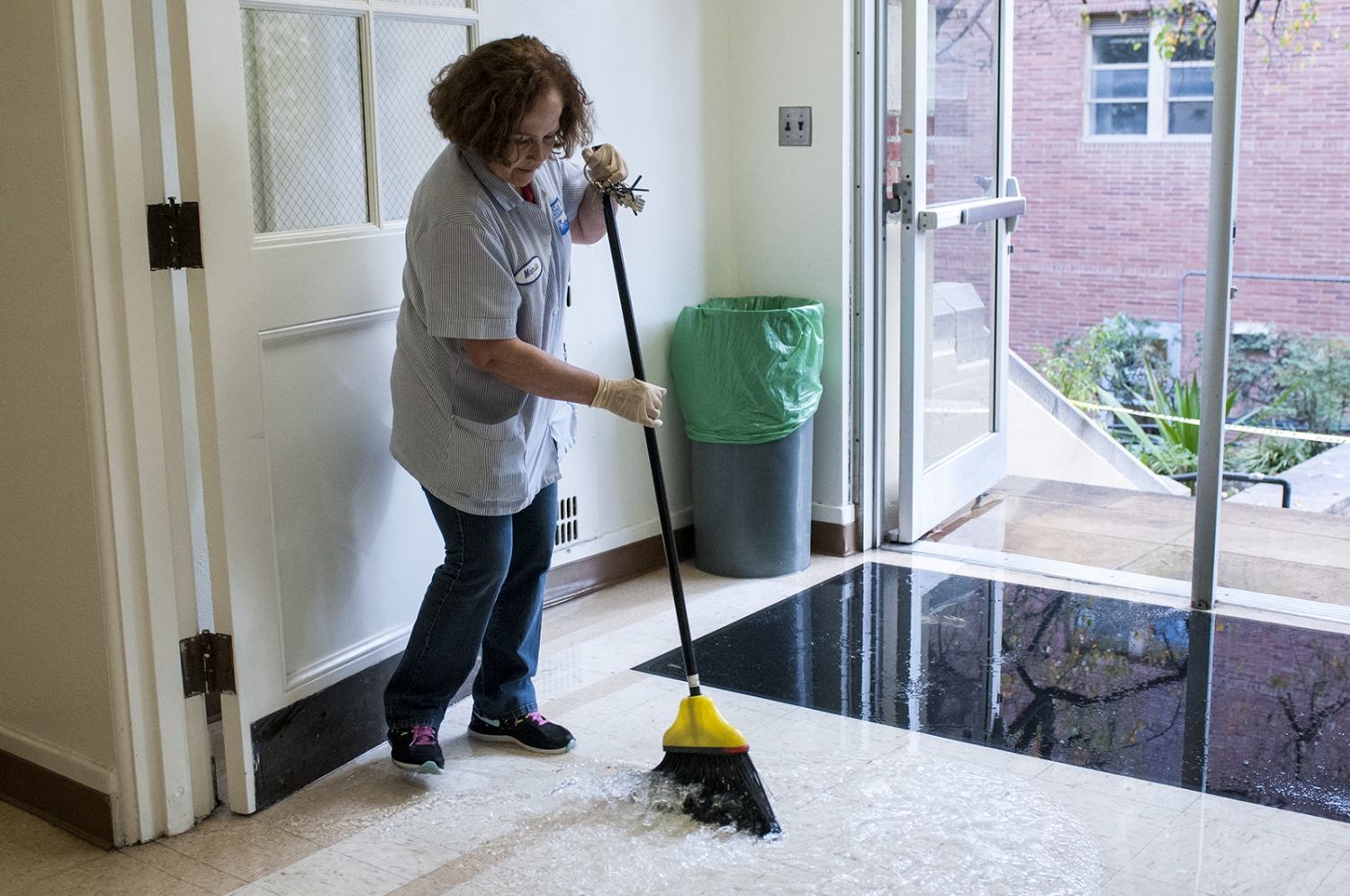 Maria De Anda, a UCLA Facilities Management employee, swept water from the floor of Franz Hall Thursday when a toilet in the women’s first-floor restroom in Franz Hall flooded the building’s main hallway, offices and classrooms.