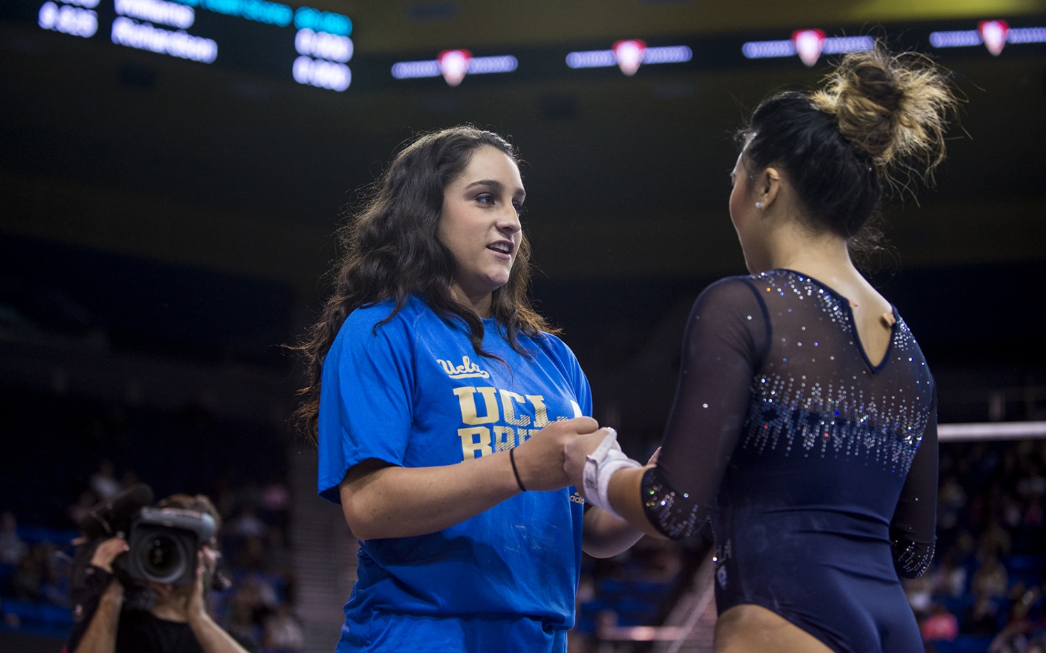 Team manager Jordyn Wieber encourages redshirt sophomore Christine Peng-Peng Lee before her routine on uneven bars.
