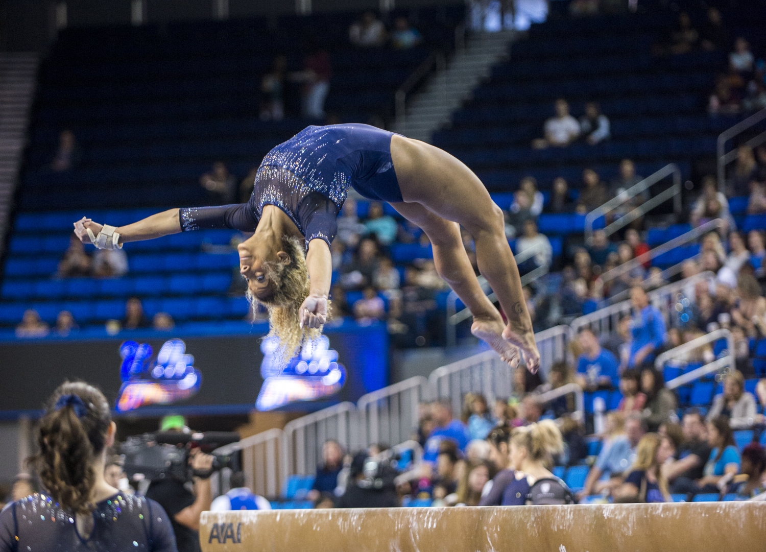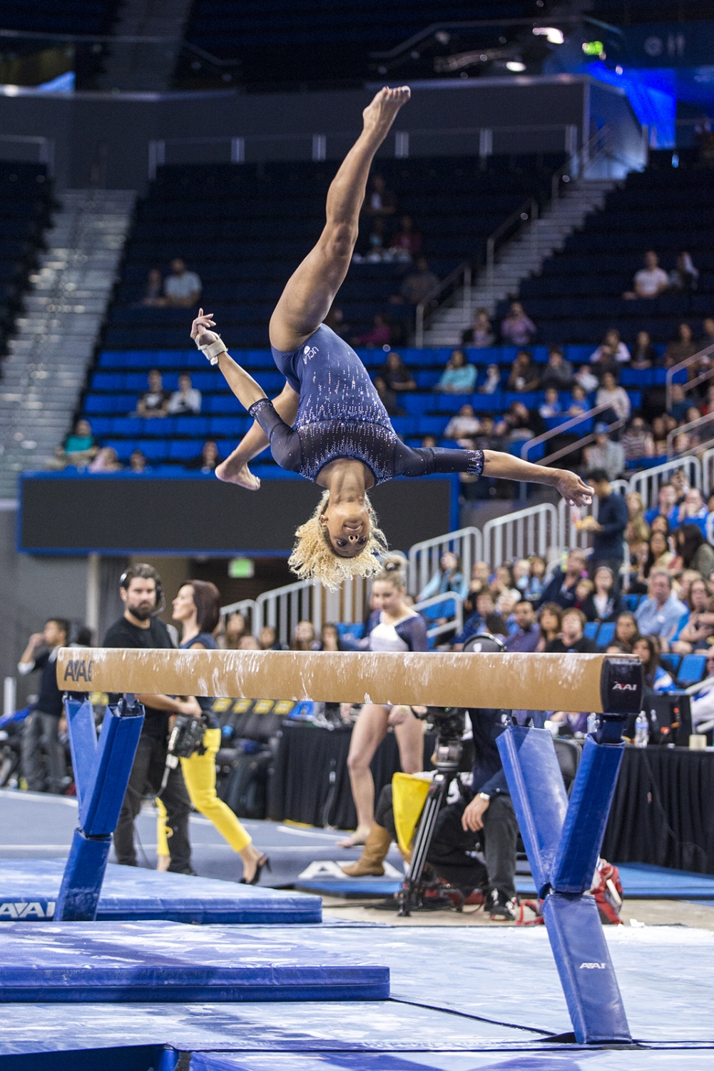 Junior Danusia Francis completes a back aerial in her beam routine.