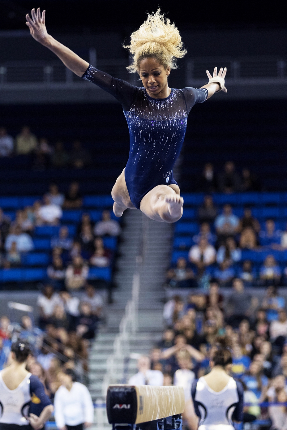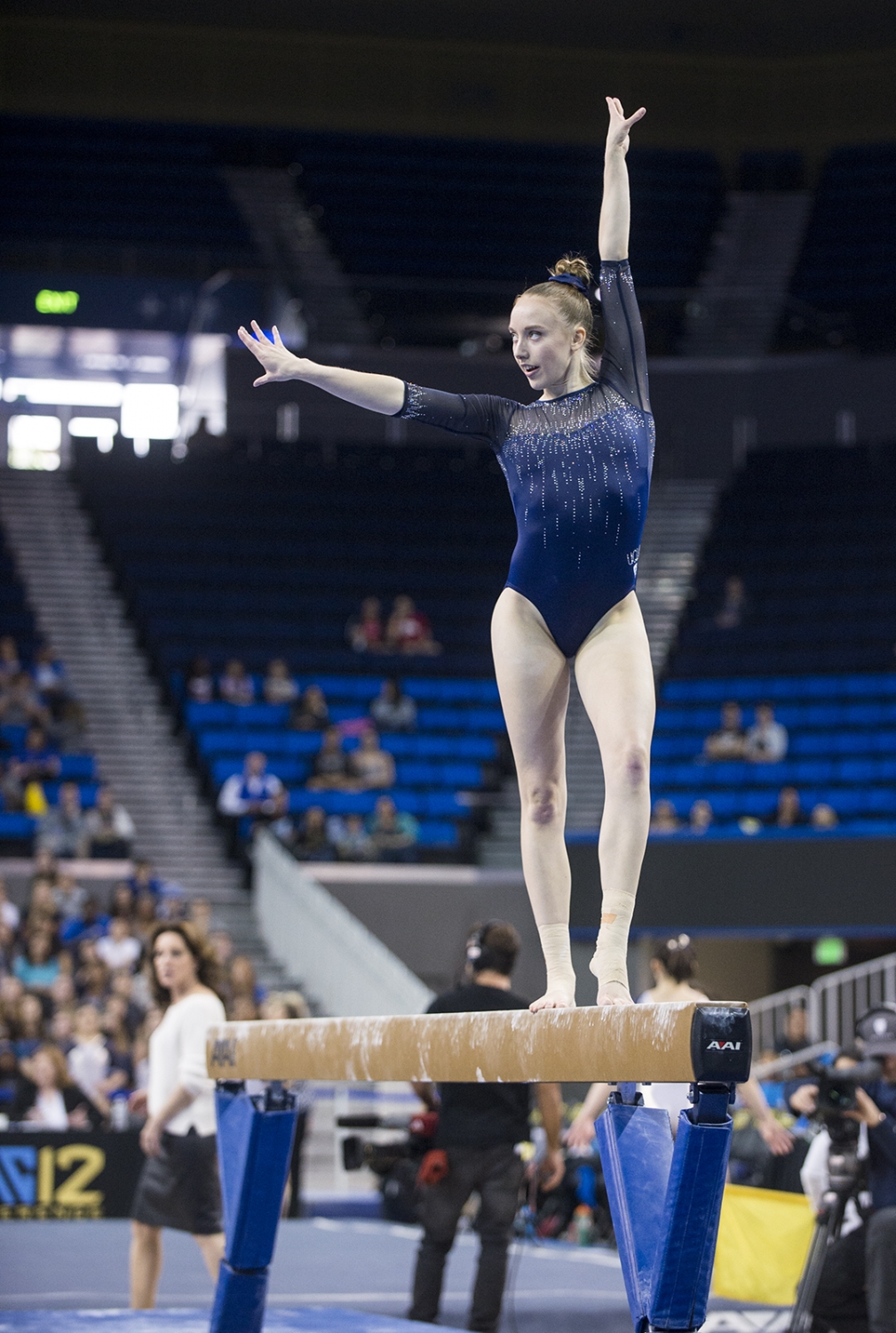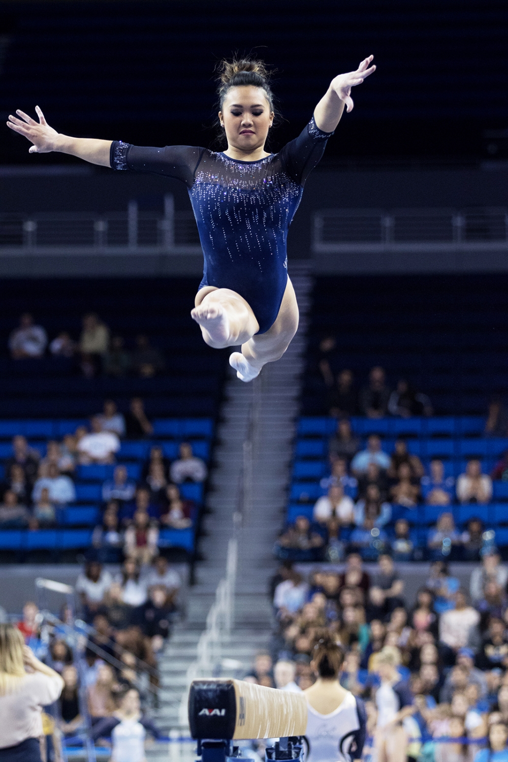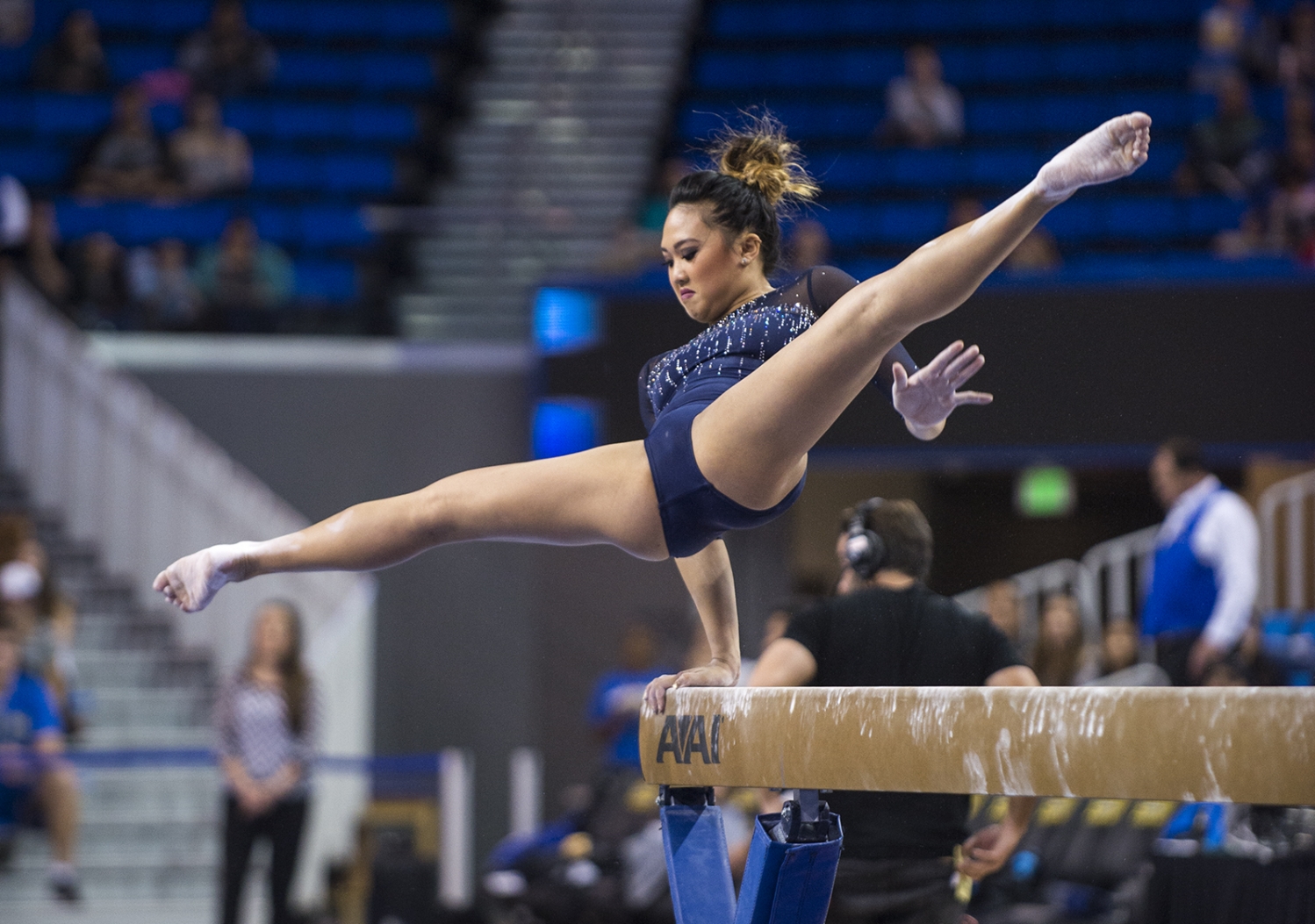 Redshirt sophomore Christine Peng-Peng Lee executes Homma flairs during her mount onto the balance beam.