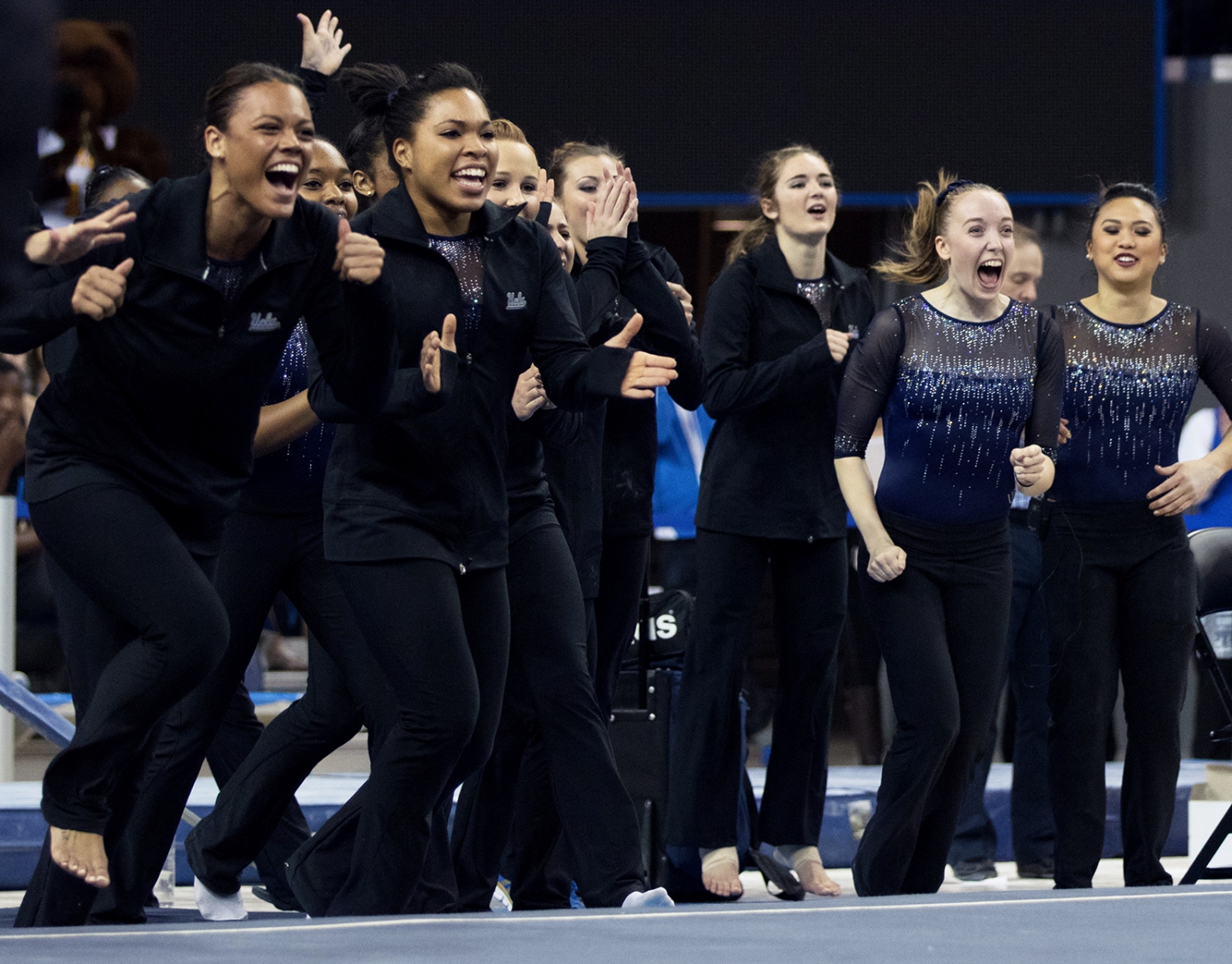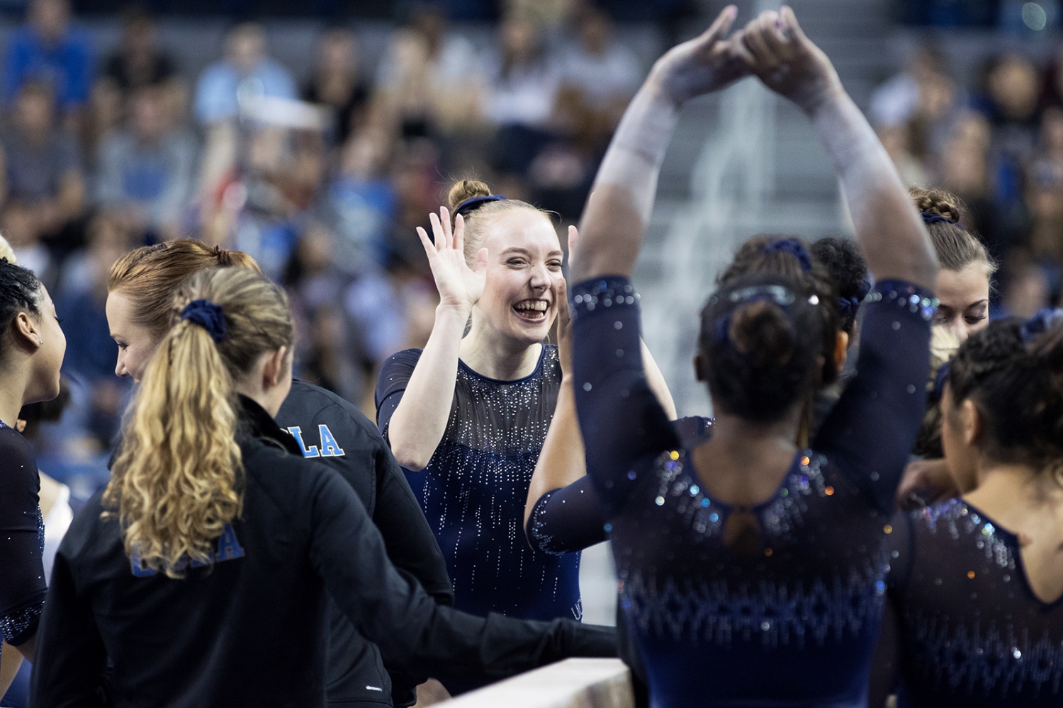 Sophomore Mikaela Gerber's teammates rush to congratulate her following her beam routine.