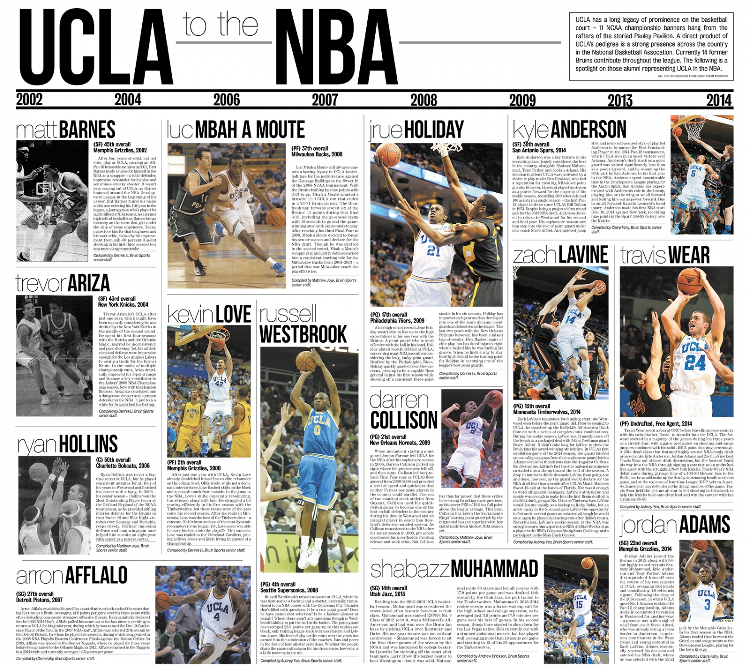 UCLA has a long legacy of prominence on the basketball court – 11 NCAA championship banners hang from the rafters of the storied Pauley Pavilion. A direct product of UCLA's pedigree is a strong presence across the country in the NBA. Currently 14 former Bruins contribute throughout the league. The following is a spotlight on those alumni representing UCLA in the NBA.