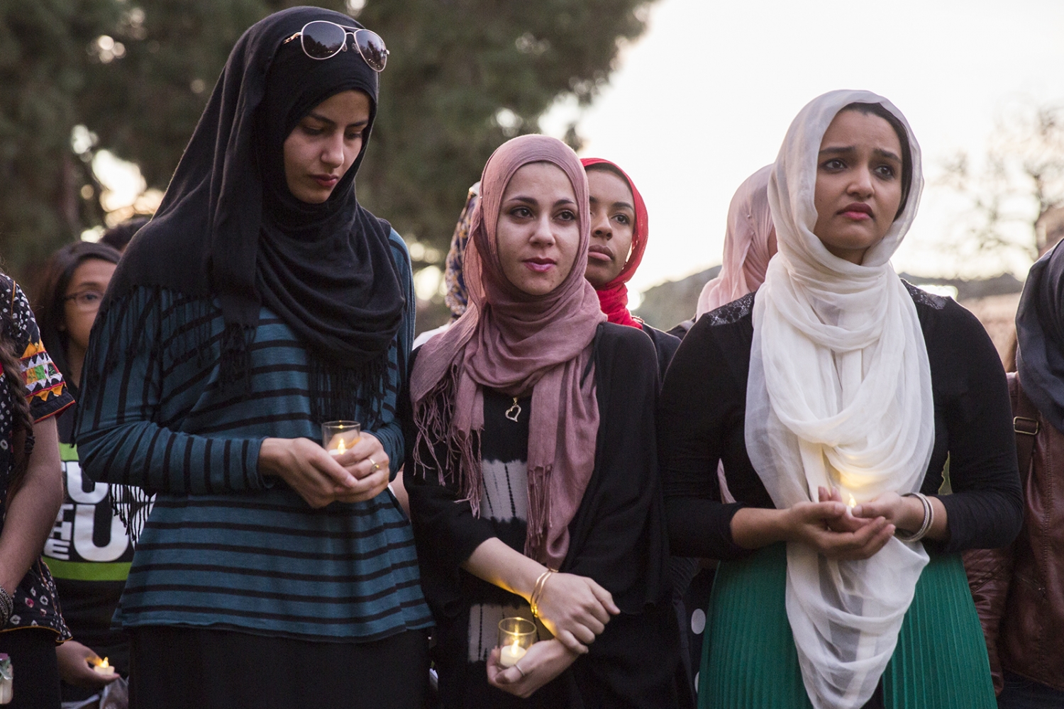 Nabilah Abdelaal, a fourth-year biology student; Raman Kaur, a fifth-year biophysics student; and Sabrina Dahak, a fourth-year human biology and society and Spanish student hold candles during the closing ceremony of the Chapel Hill vigil Thursday afternoon.