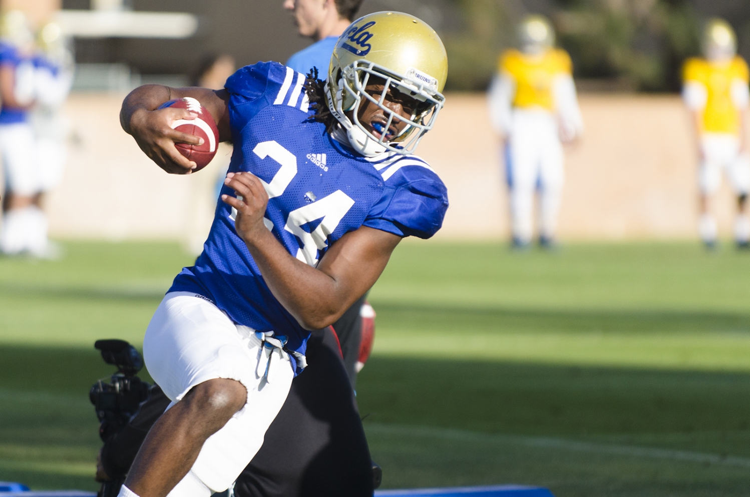 Redshirt junior running back Paul Perkins said he hopes to improve his ability to read the opposing defense and find gaps quicker during the ongoing UCLA football spring training. Perkins ended last season as the Pac-12’s leading rusher with 1,575 yards.