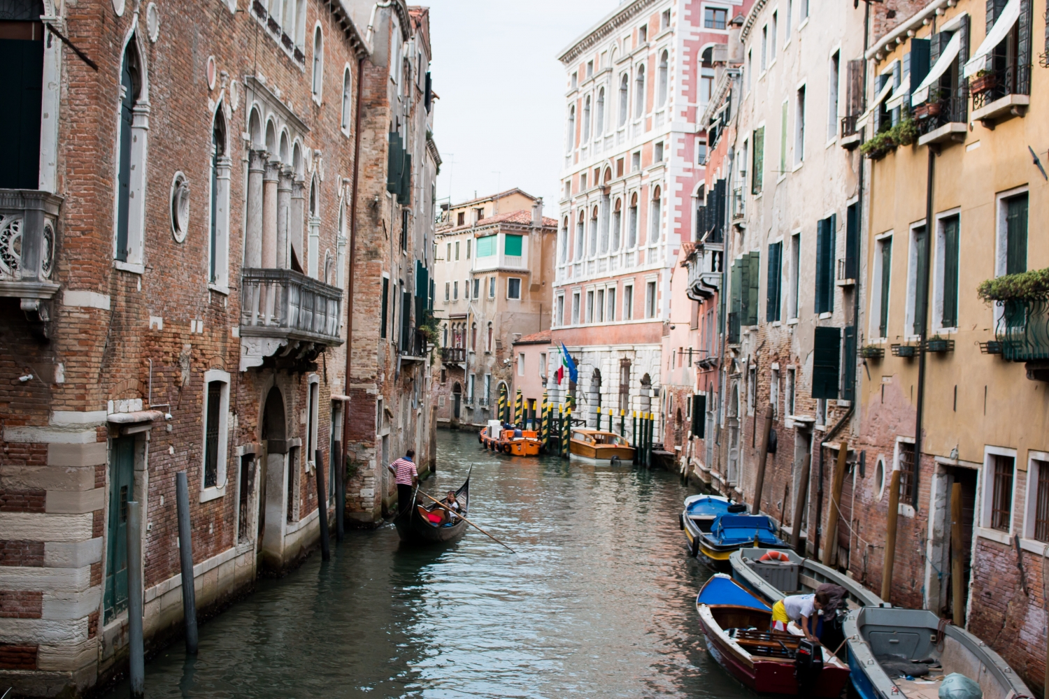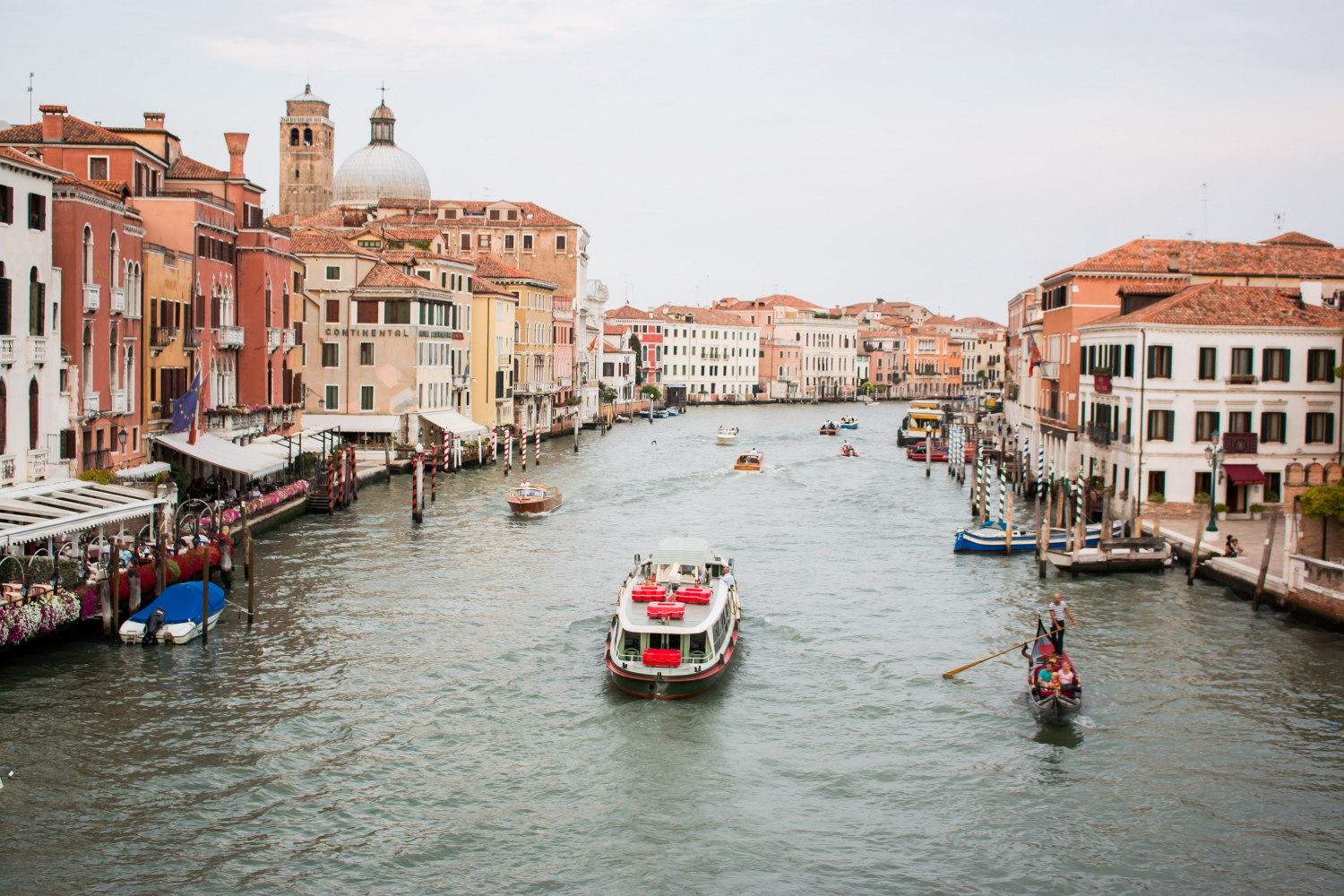 Gondolas and taxi boats make their way through the Grand Canal, the largest river in Venice, Italy.