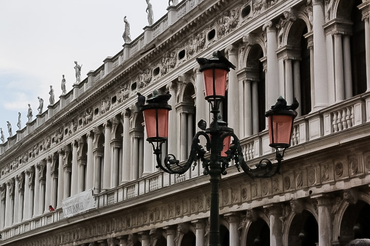 The street lamps of Venice, like this one seen in Piazza San Marco, are painted in Venetian Pink, a color used to portray something's significance.