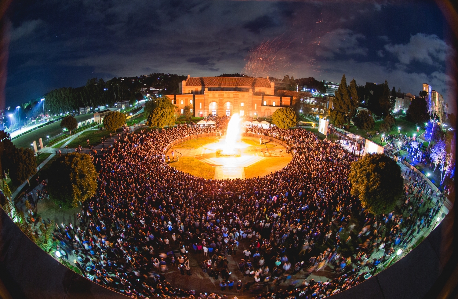 A fisheye view from the top of the Student Activities Center shows the energy and pride of the Beat 'SC bonfire.