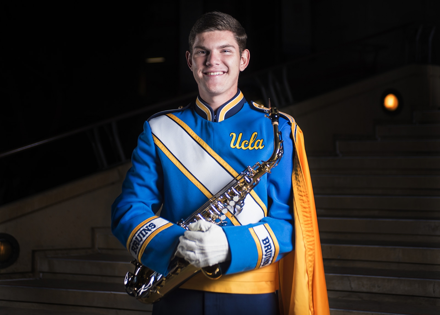 Second-year mechanical engineering student Noah Ashman leads the alto sax section of the UCLA Marching Band. Since last year’s rivalry game was at the Rose Bowl, Saturday’s game will be his first at the Coliseum.