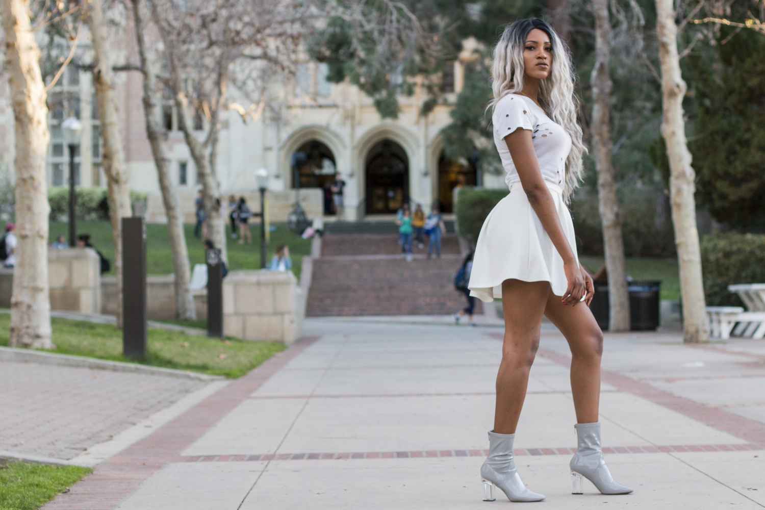 "I like my Stan Smith shoes because they have this cool style that is just appropriate for relaxed campus look. But still, I didn't want to look too comfy and decided to complete my outfit with a piece of jewelry-- my necklace. It's silver, so kind of eye catching on my black t-shirt, that's why I chose to wear it. I preferred to have my pled backpack because its color matches my t-shirt and shoes," said Ela Talu, a first-year art history major.