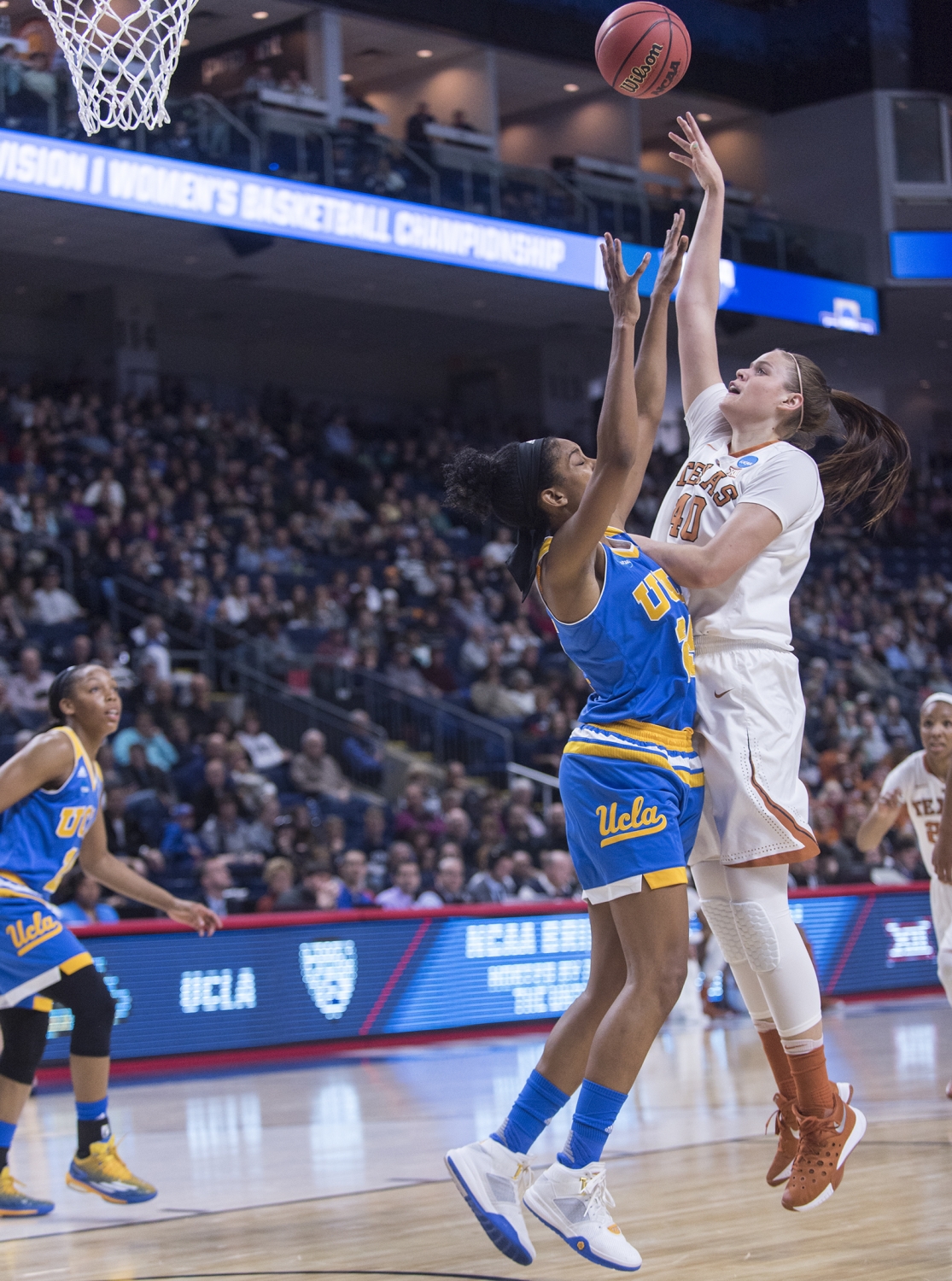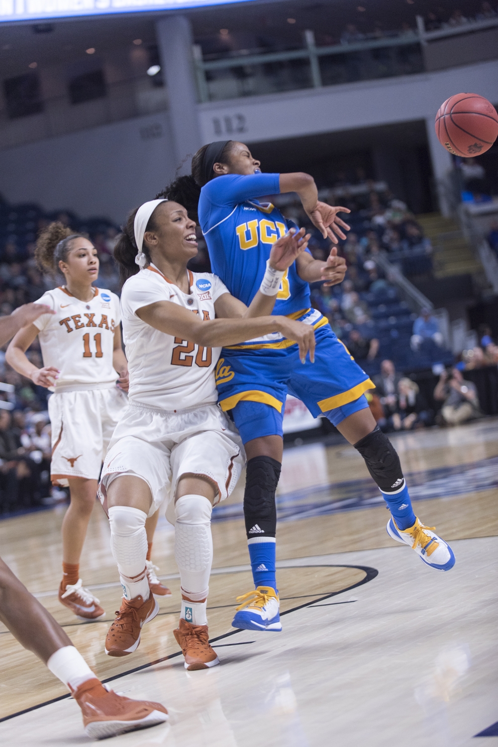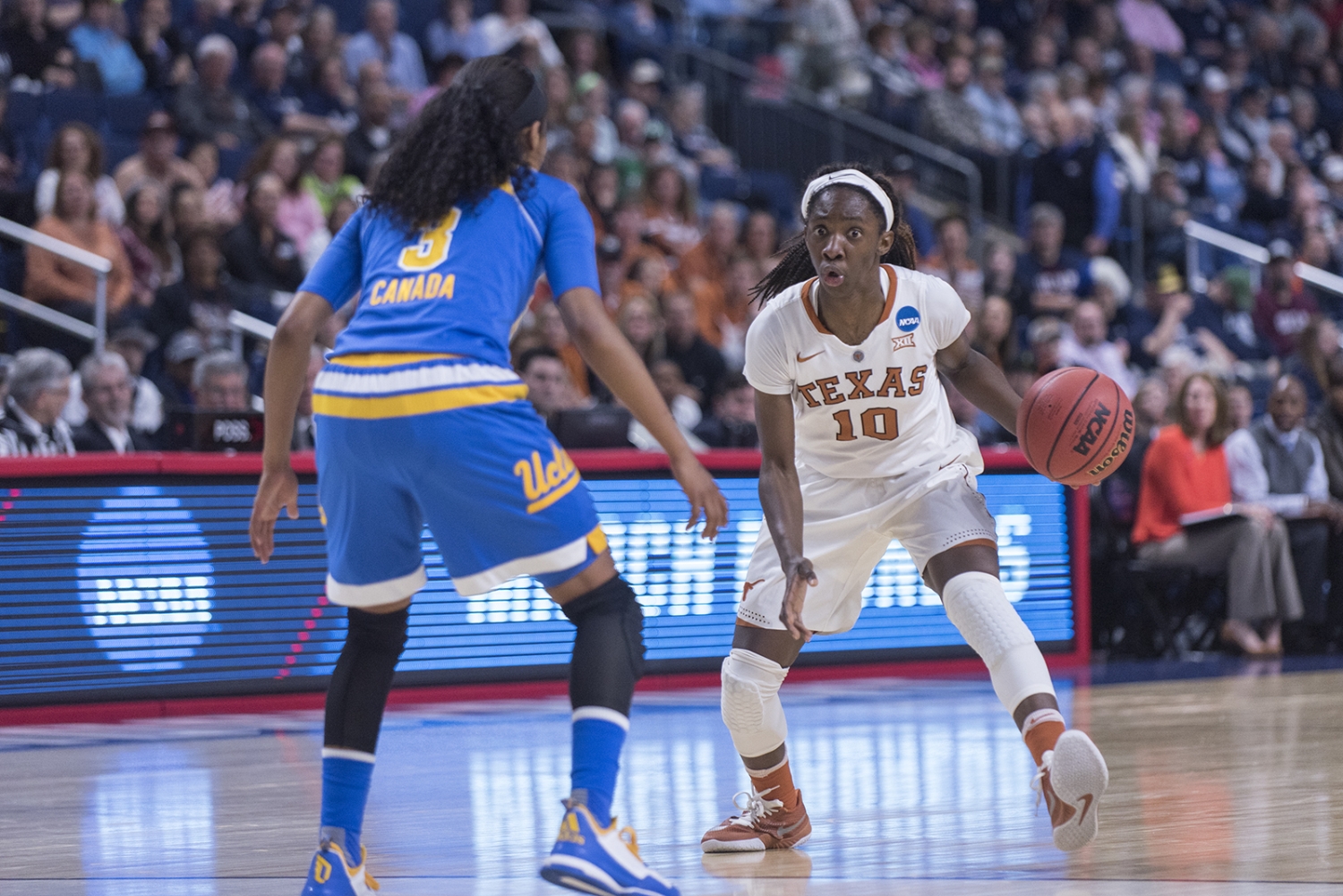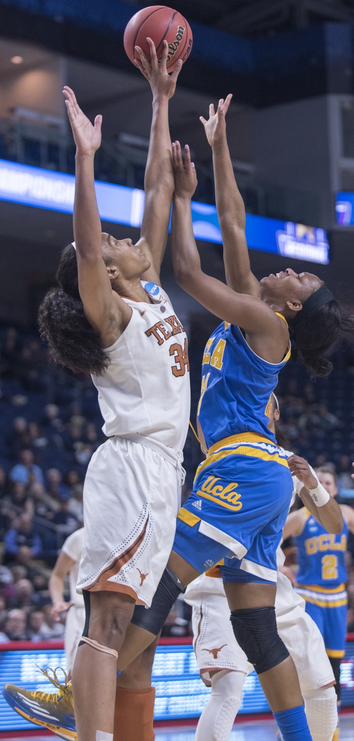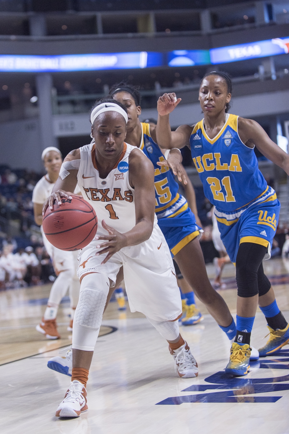 Texas Guard Empress Davenport closely defends a ball from UCLA defense.