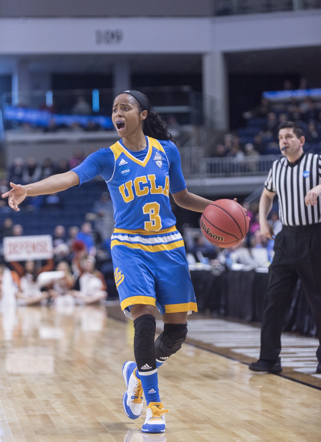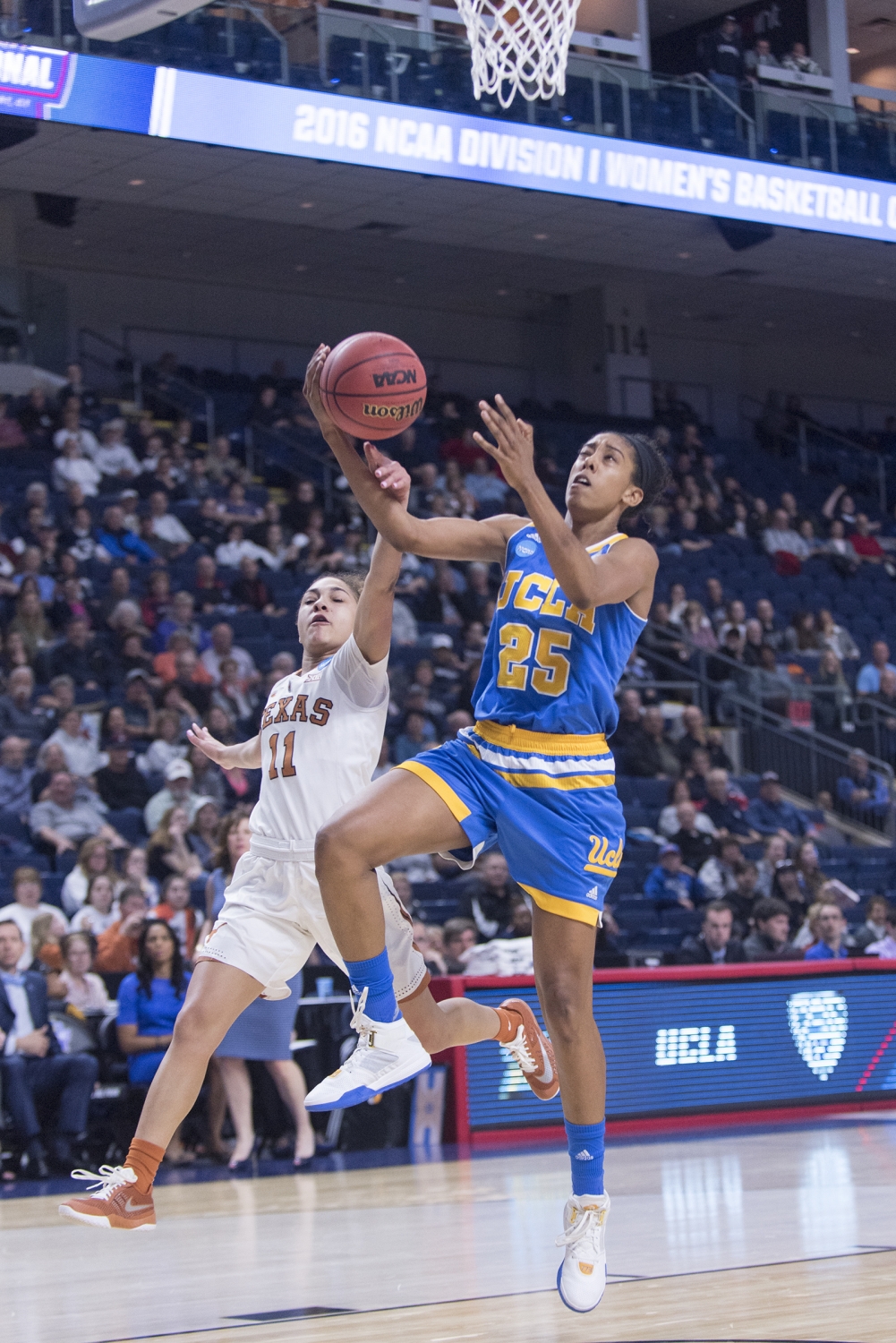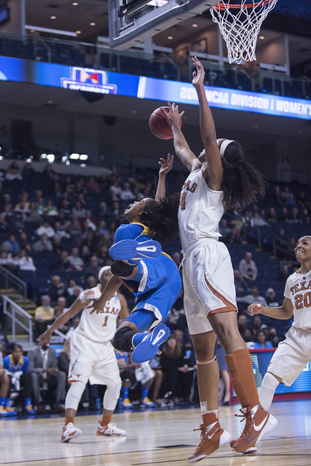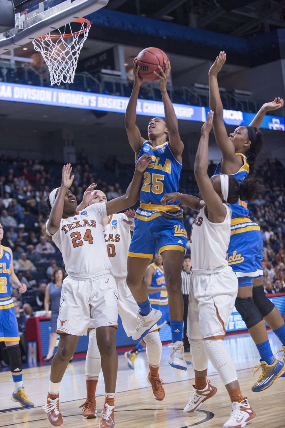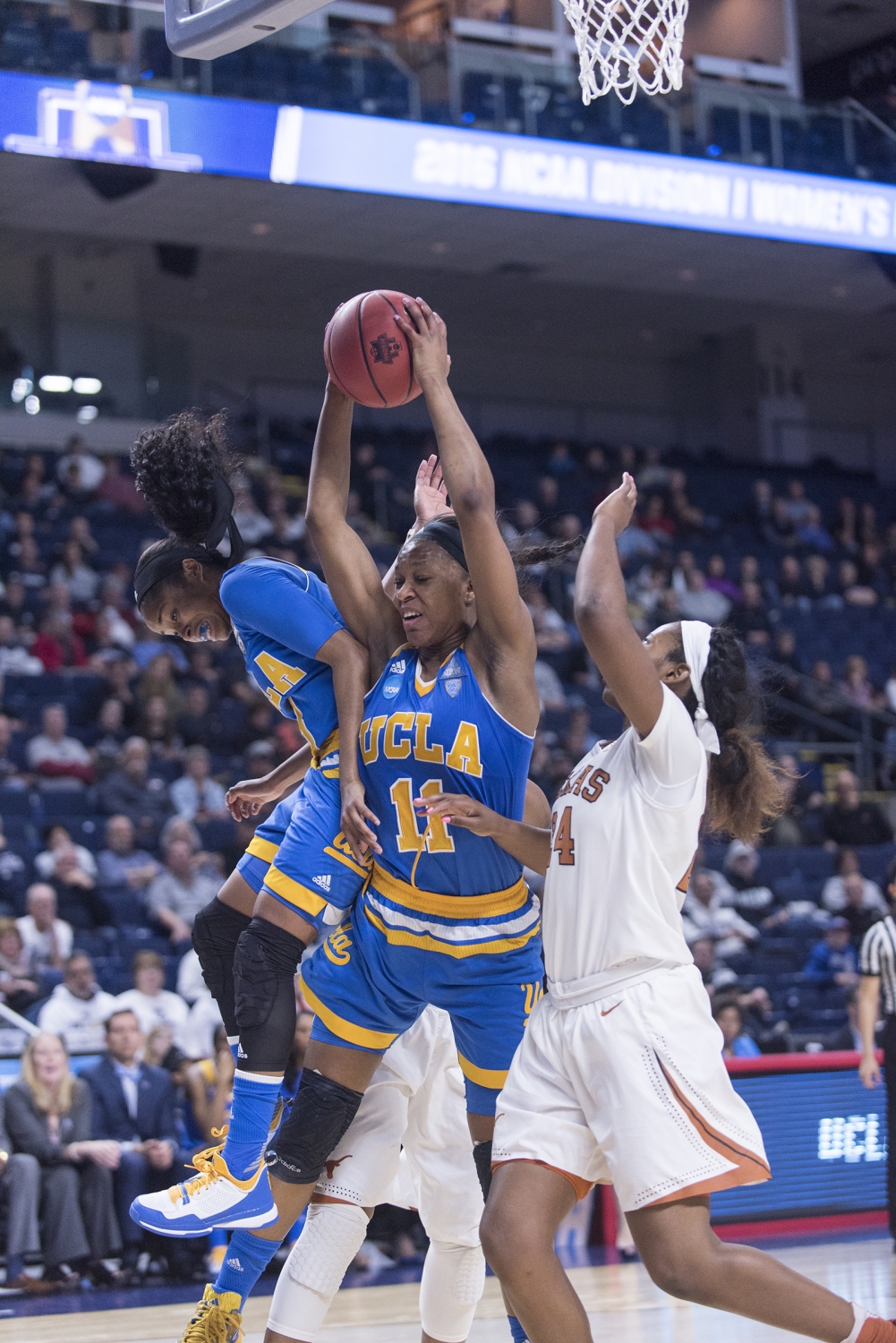 Texas Guard Empress Davenport closely defends a ball from UCLA defense.