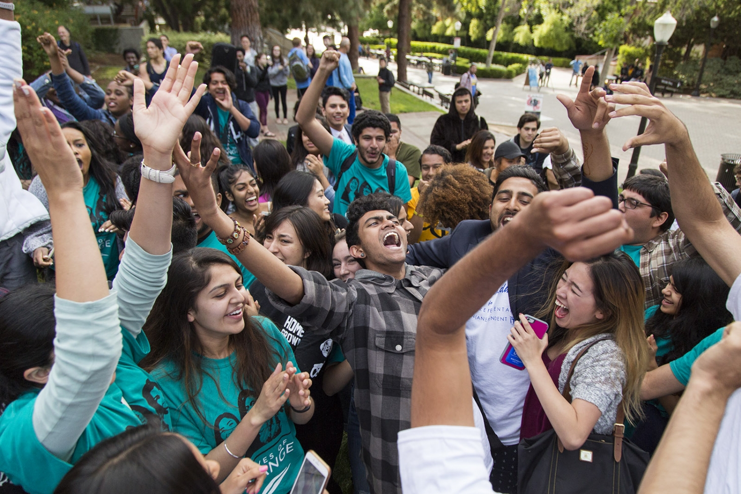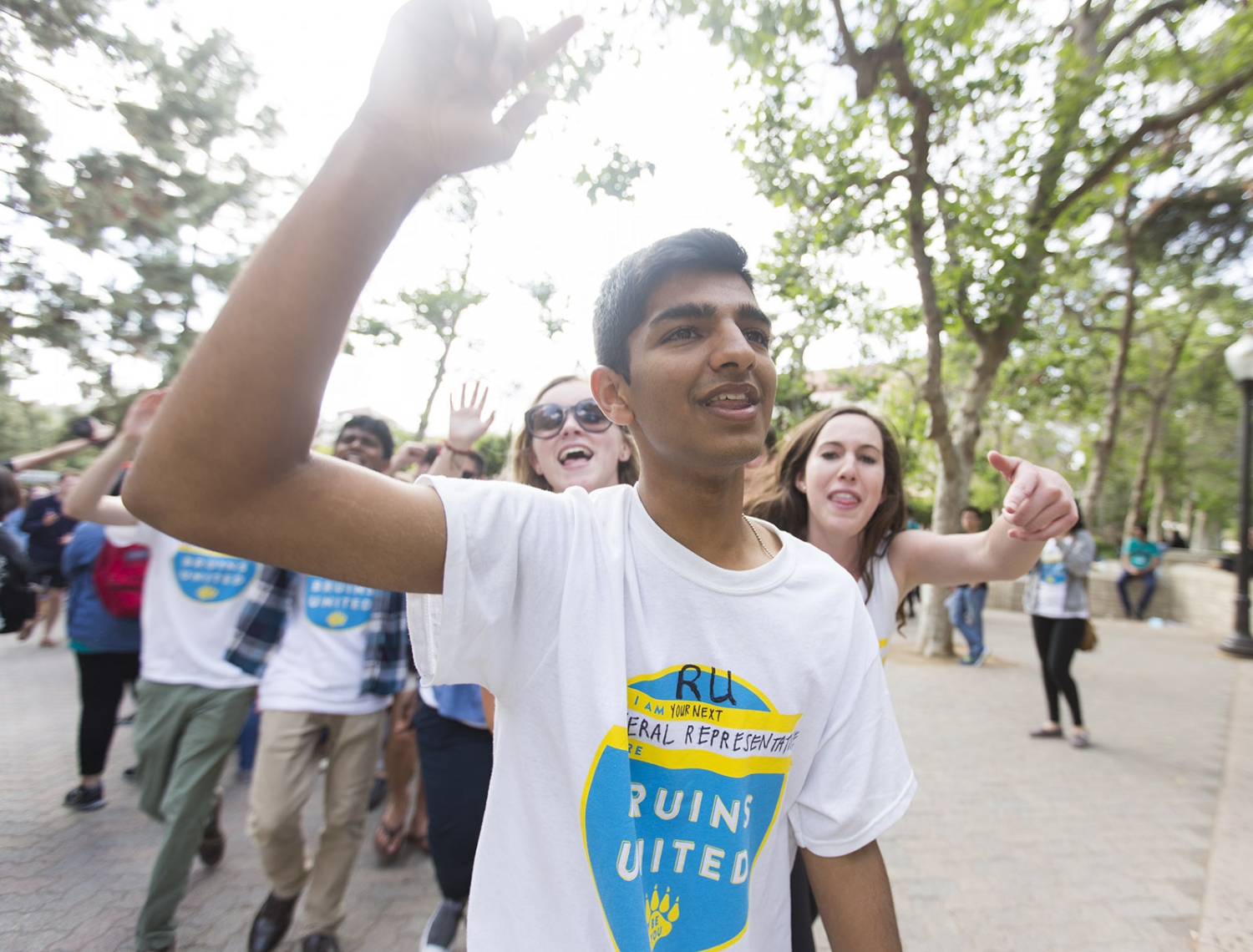 Ruchit Majmudar of Bruins United excitedly storms up Bruin Walk in anticipation of election results. Majmudar was elected third general representative of USAC.