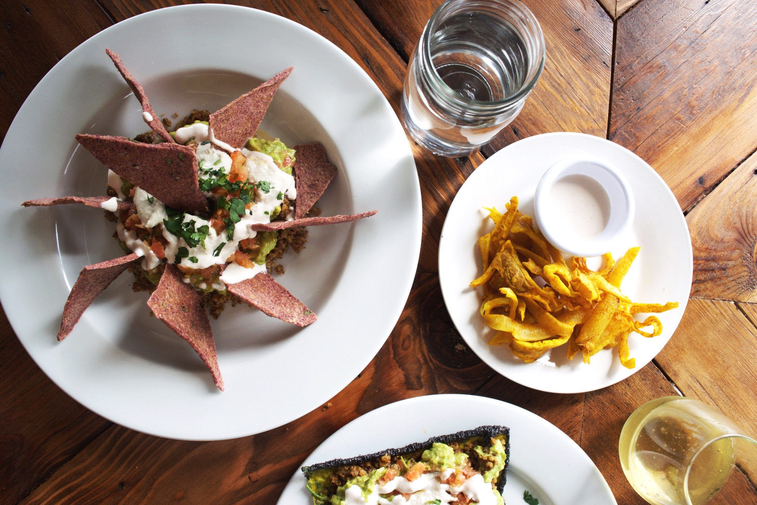RAWvolution in Santa Monica offers raw vegan options made of uncooked fruits and vegetables. The Mexican entree Nachos Grandes includes minced walnuts and pico de gallo on seed and spinach chips, while the Mexican Pizza used a sheet of nori seaweed as the vegan-friendly crust.