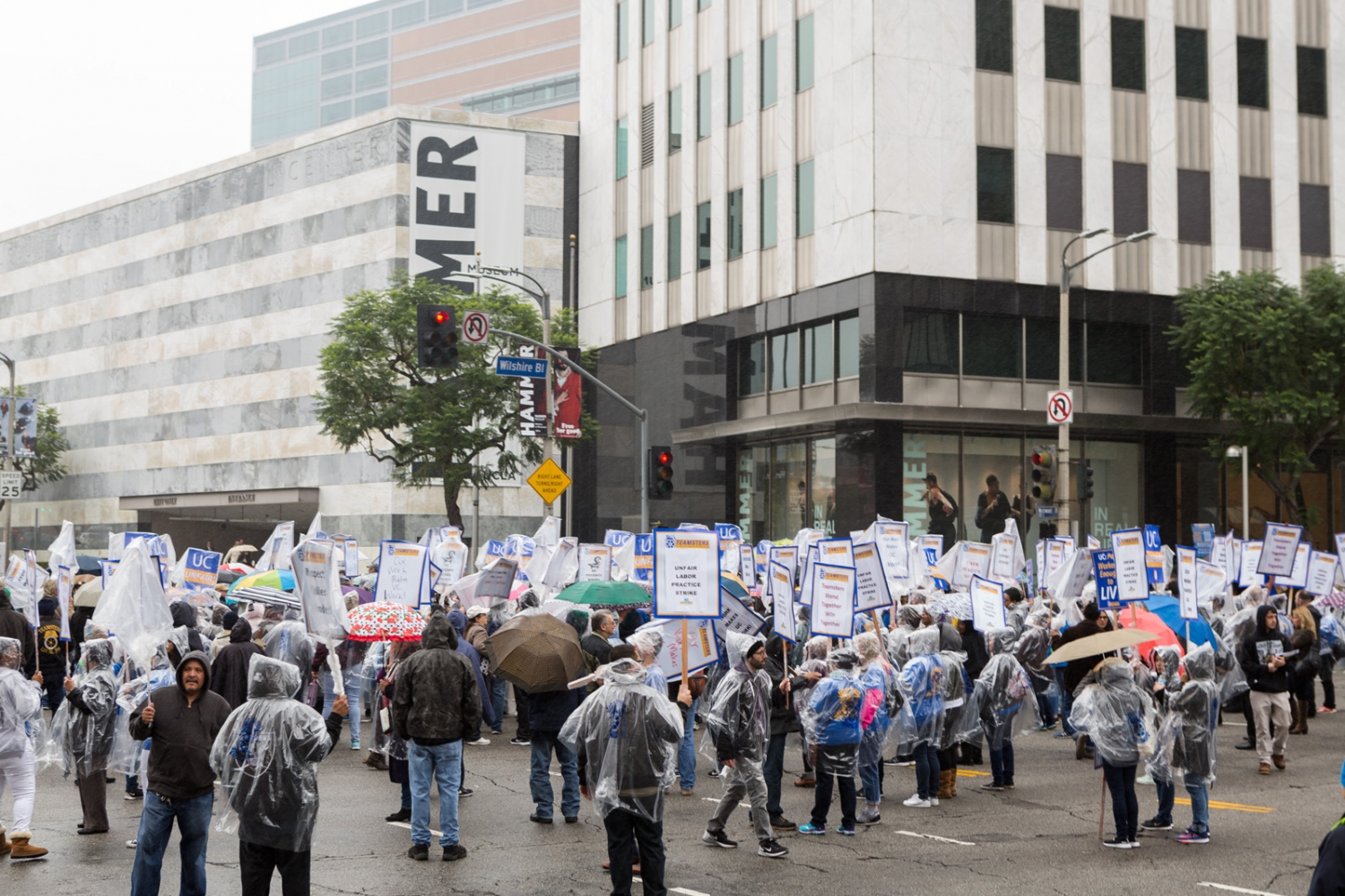 Strikers marched on campus and throughout Westwood, venturing into the intersection of Westwood Boulevard and Wilshire Boulevard, temporarily disrupting traffic.
