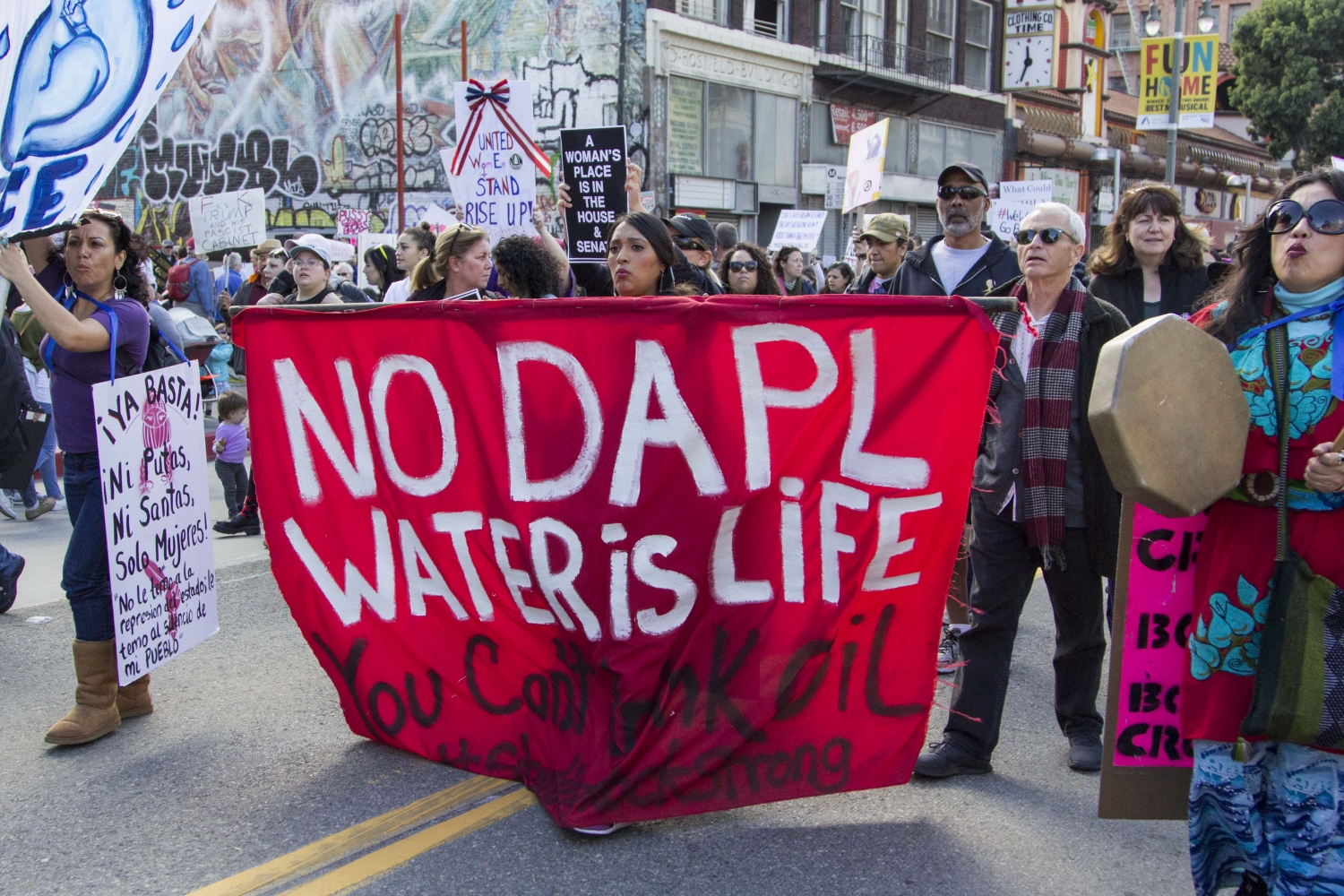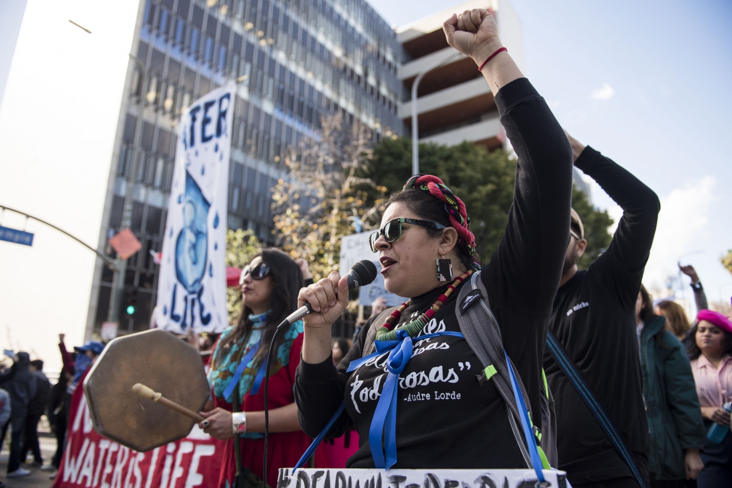 Native women march the streets of Los Angeles advocating against the Dakota Access Pipeline.