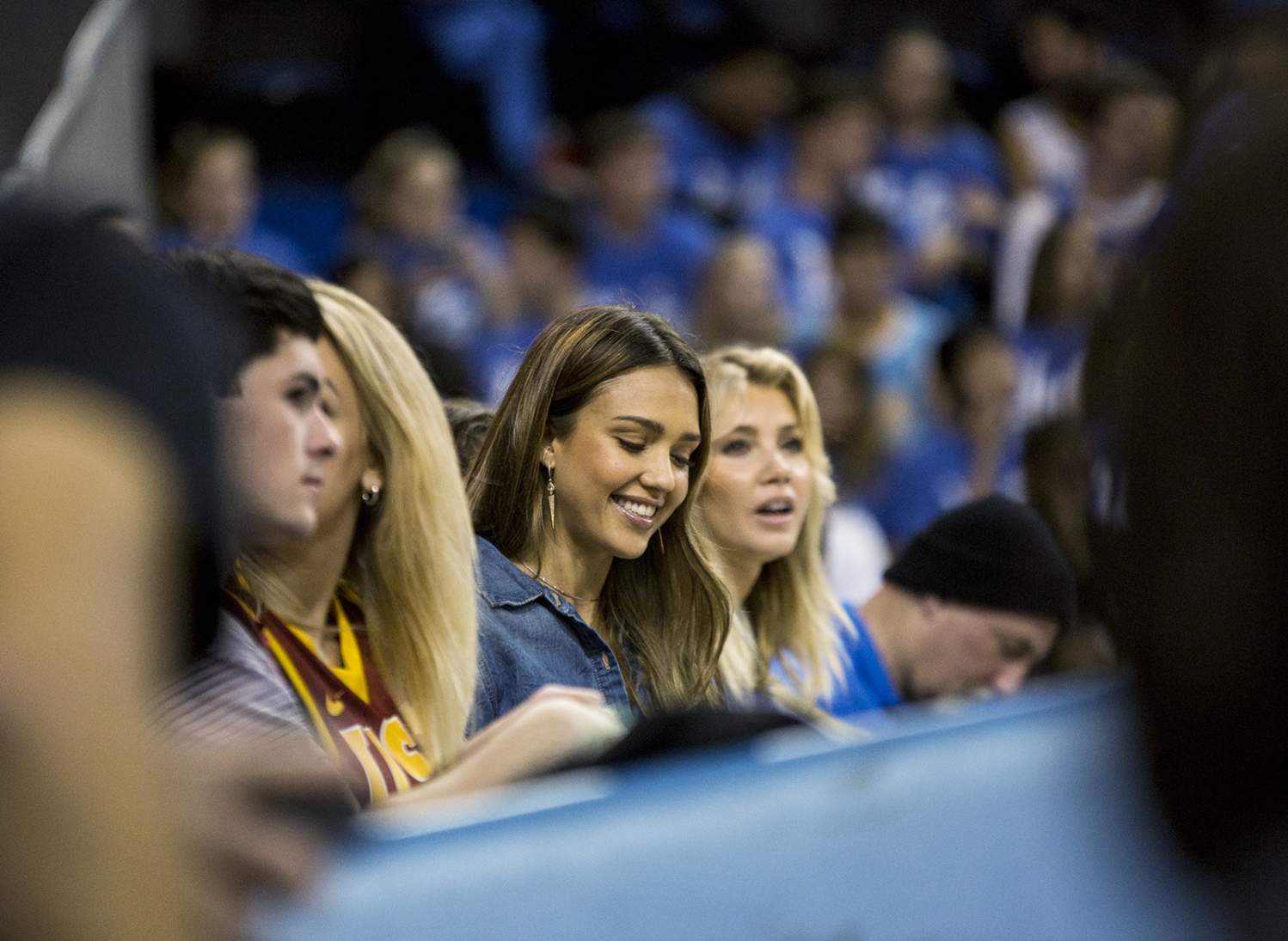 Actress Jessica Alba smiled after being asked for a selfie with members of the UCLA Spirit Squad.