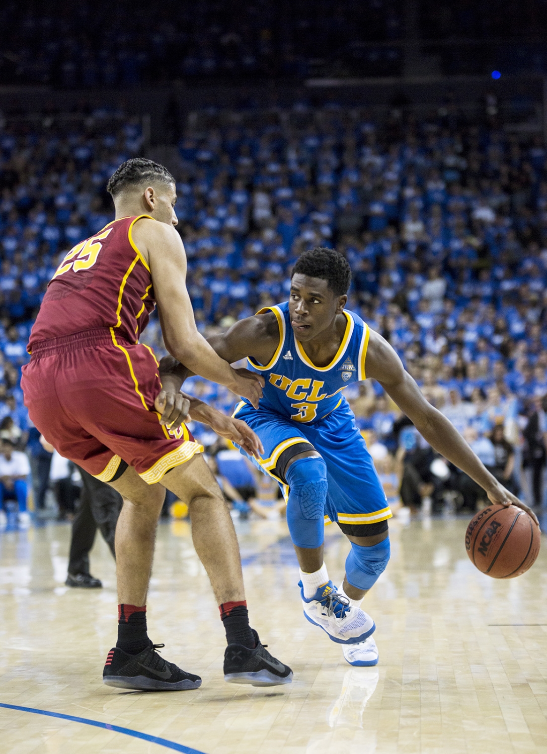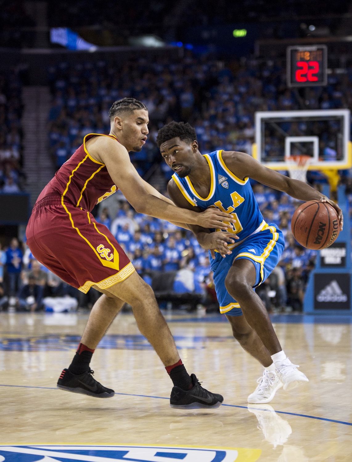 Sophomore guard Aaron Holiday and USC forward Bennie Boatwright face off at the arc.