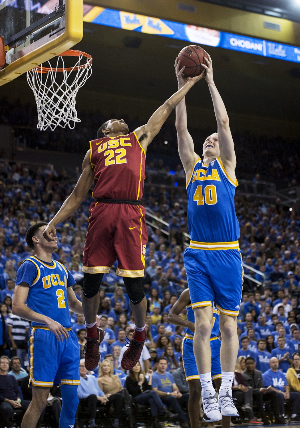 Junior center Thomas Welsh grabs a rebound from USC guard De'Anthony Melton.