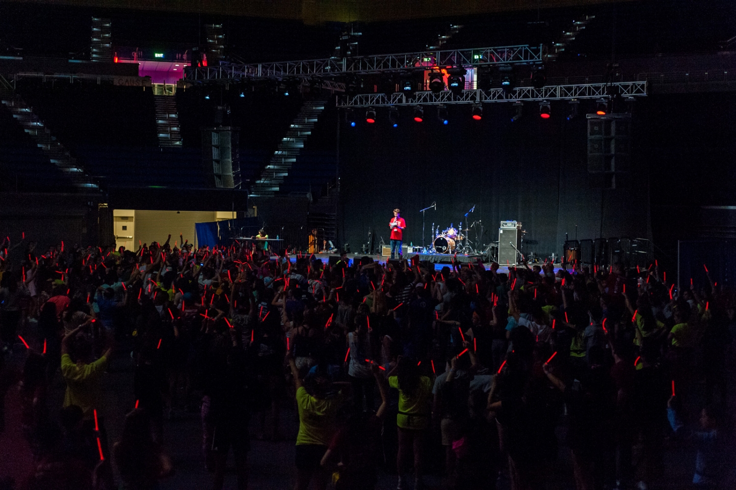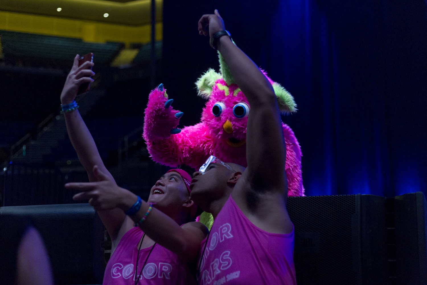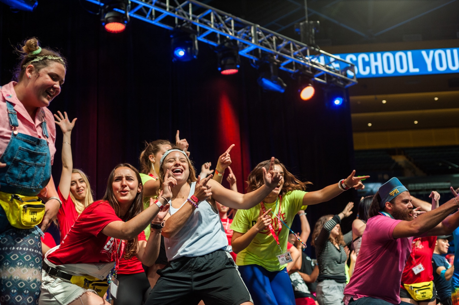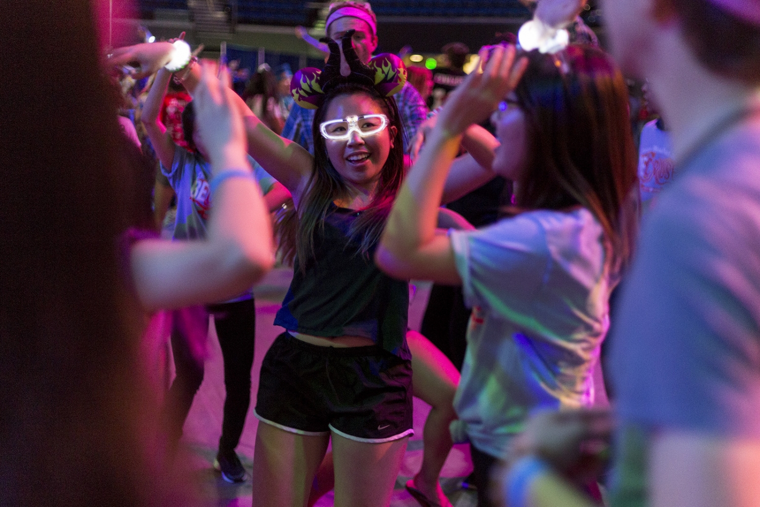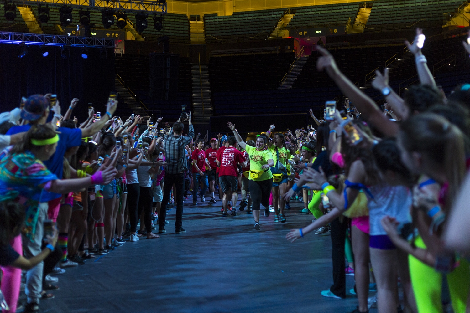 A moraler gets on the stage to excite the Dance Marathon crowd.