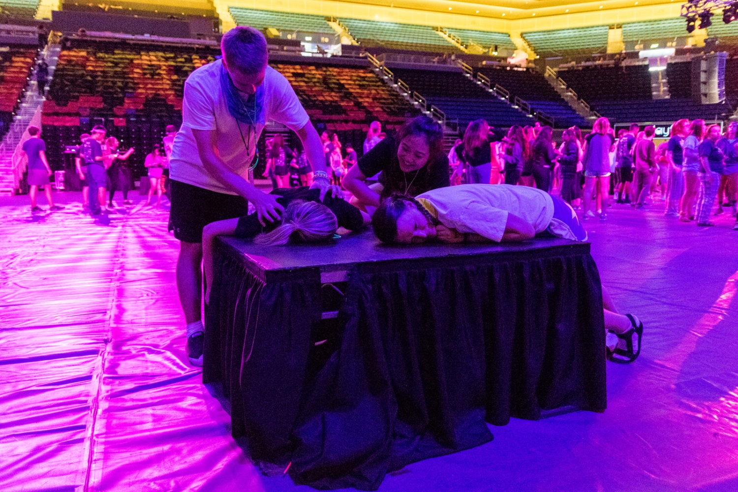Exhausted students take a temporary break from dancing by leaning over empty platforms. Participants can continue for as long as they can stay on their feet, but are disqualified if they fully sit down.
