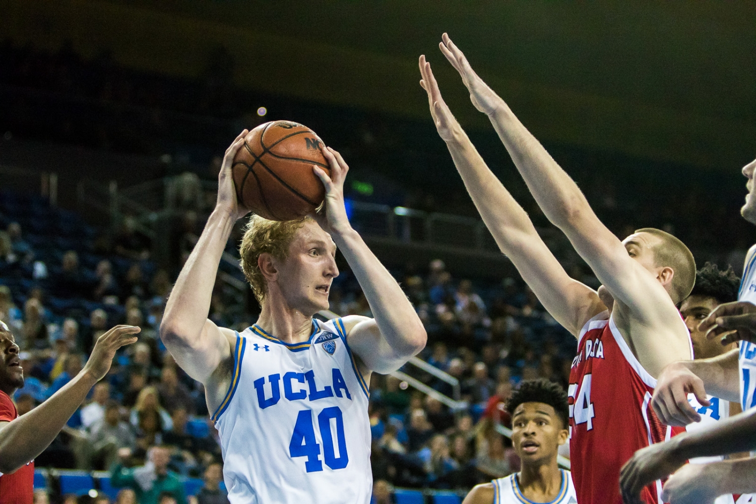 Senior center Thomas Welsh looks to inbound the ball past a South Dakota defender. Welsh was UCLA's top scorer of the night with 19 points and also grabbed 11 rebounds.