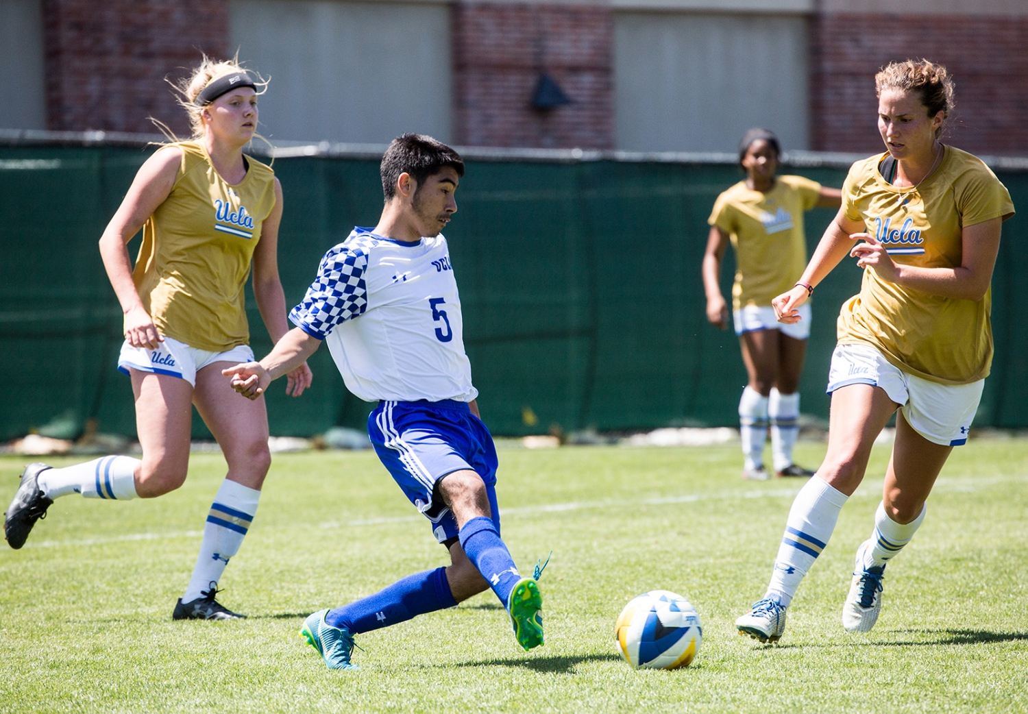 Juan Murgo, a third-year applied mathematics student, kicks the ball during a friendly matchup between UCLA men's club soccer and UCLA women's soccer team.