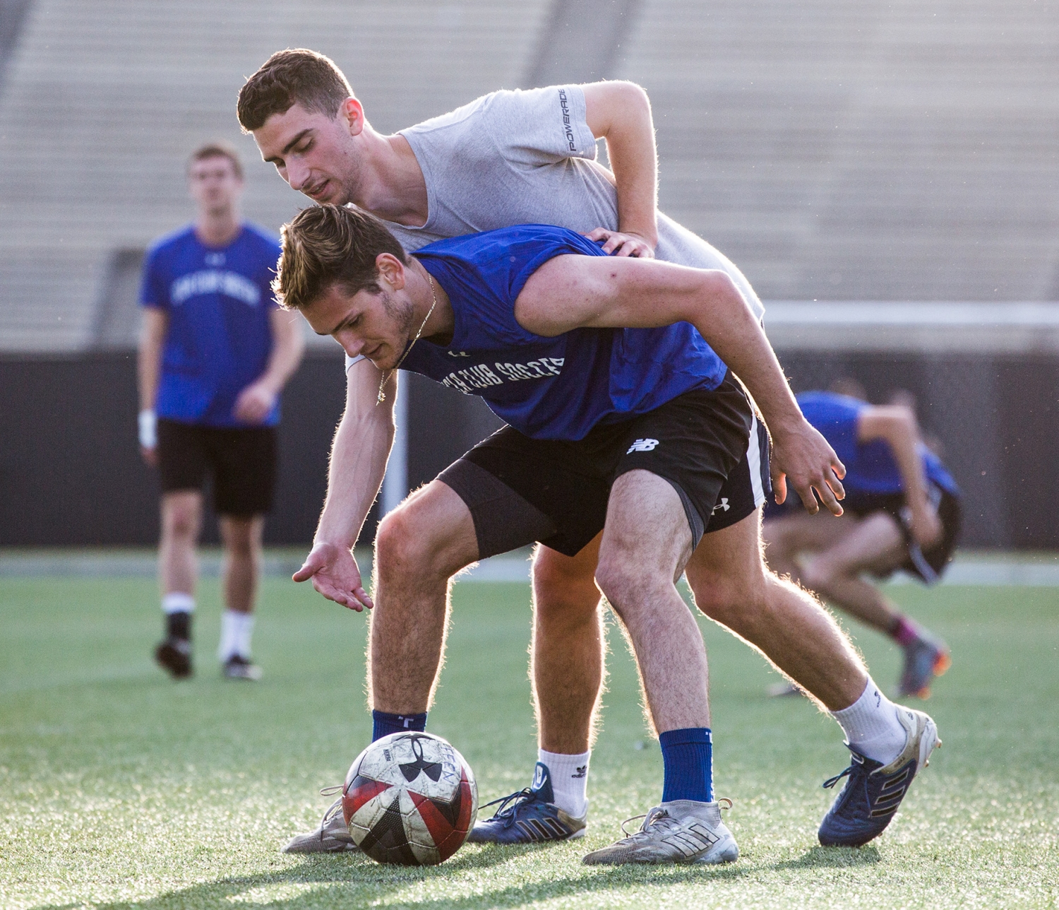 Anthony Salvadori, a third-year business economics student, blocks out Nathan Logan, a third-year business economics student, in a practice drill.