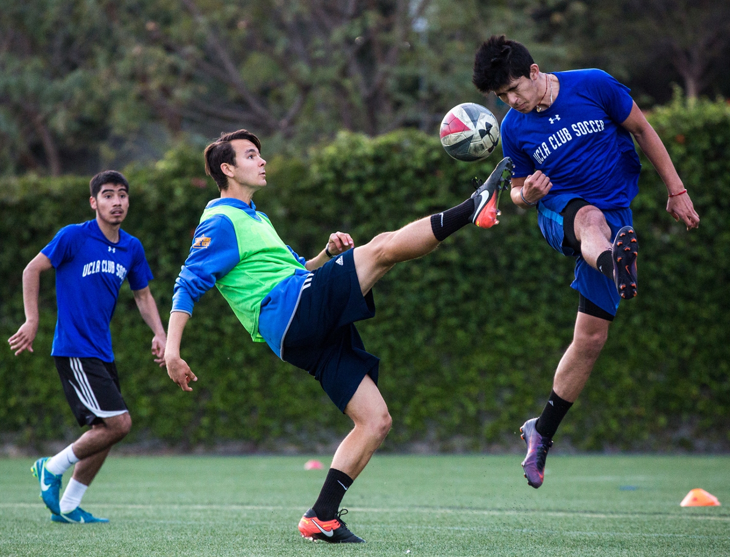 Grady Howe, a UCLA alumnus and UCLA men's soccer's volunteer coach/director of operations, attempts a kick following a header from Trevor Loman, a first-year business economics student.