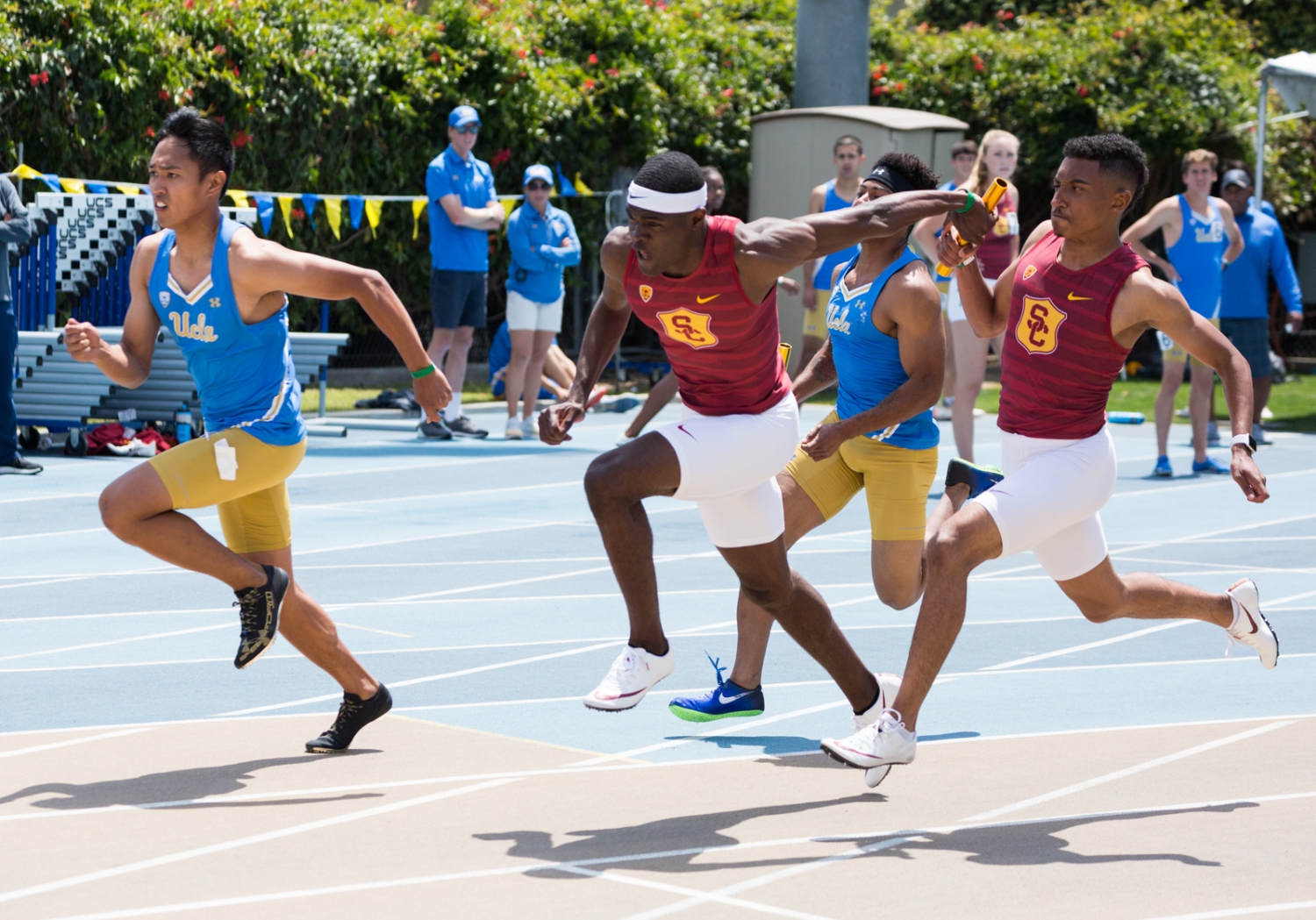 UCLA junior CJ Alumbres get's ready to take the baton from Darius Smith in the men's 4x100 relay to run the second leg against USC junior Rai Benjamin.