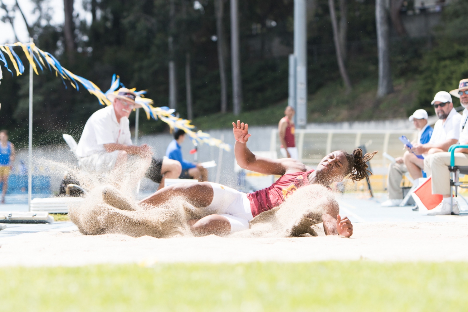 USC's Jaden Joyner lands in the sand pit for the men's long jump. Joyner got second place with a 7.07 meter jump.