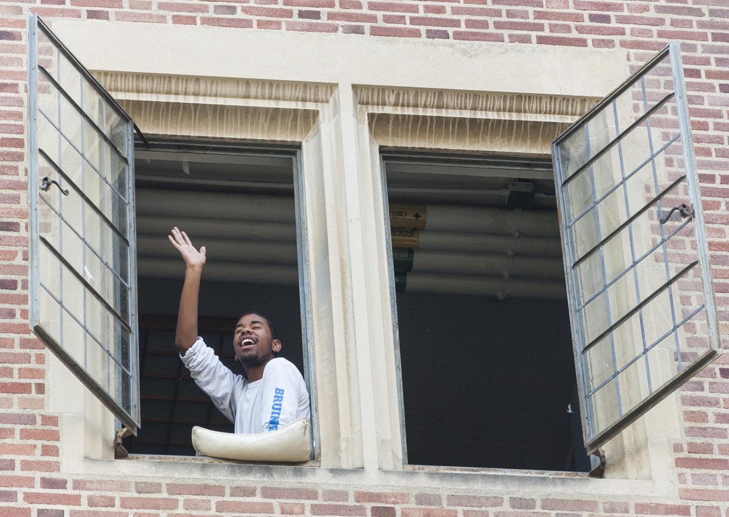Justin Jackson, who was disqualified from running for internal vice president, watches the election announced from a Kerckhoff window with a fan and pillow.