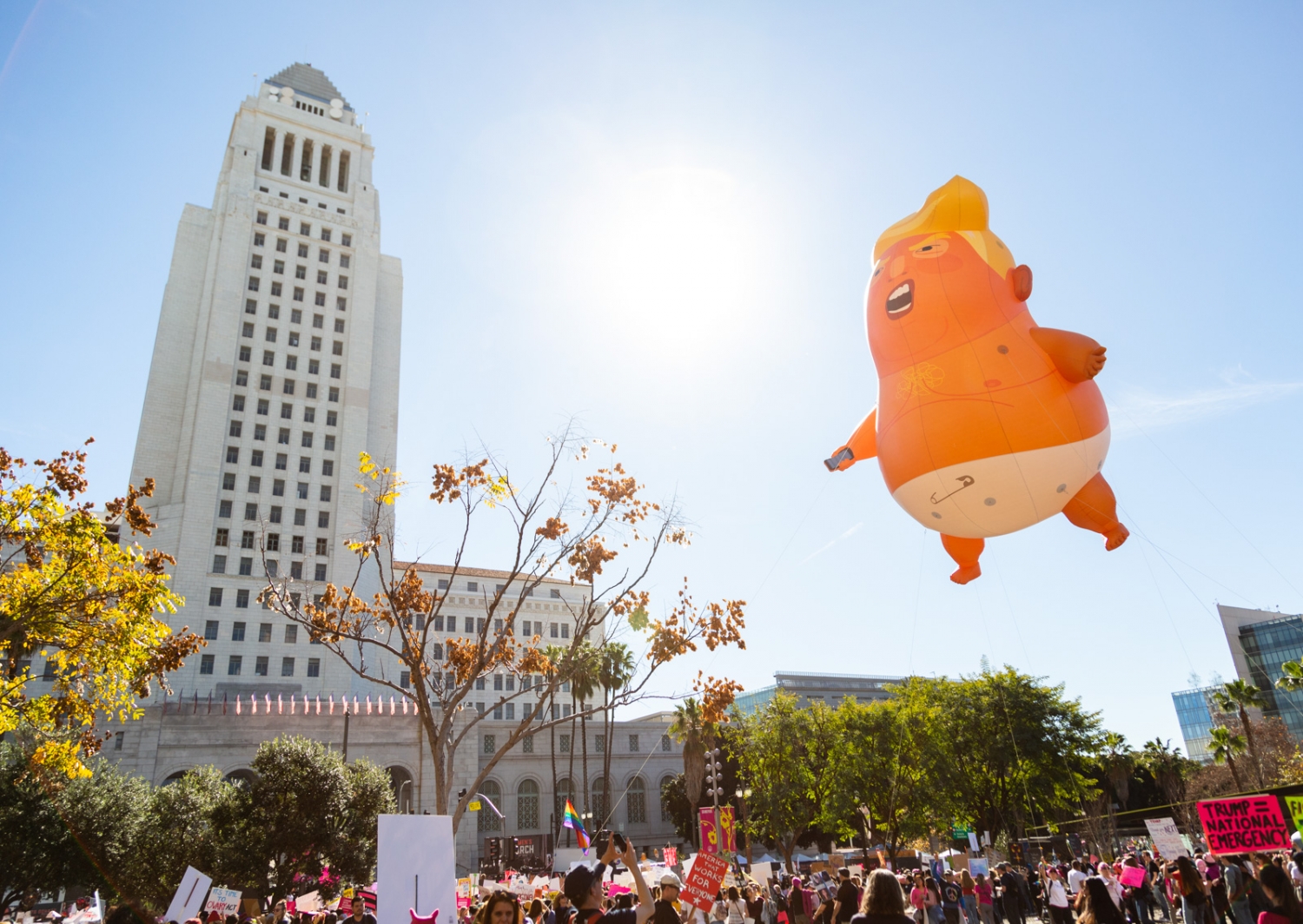 A giant baby Trump blimp flew through the sky near City Hall, similar to the one that first appeared in London in the summer.