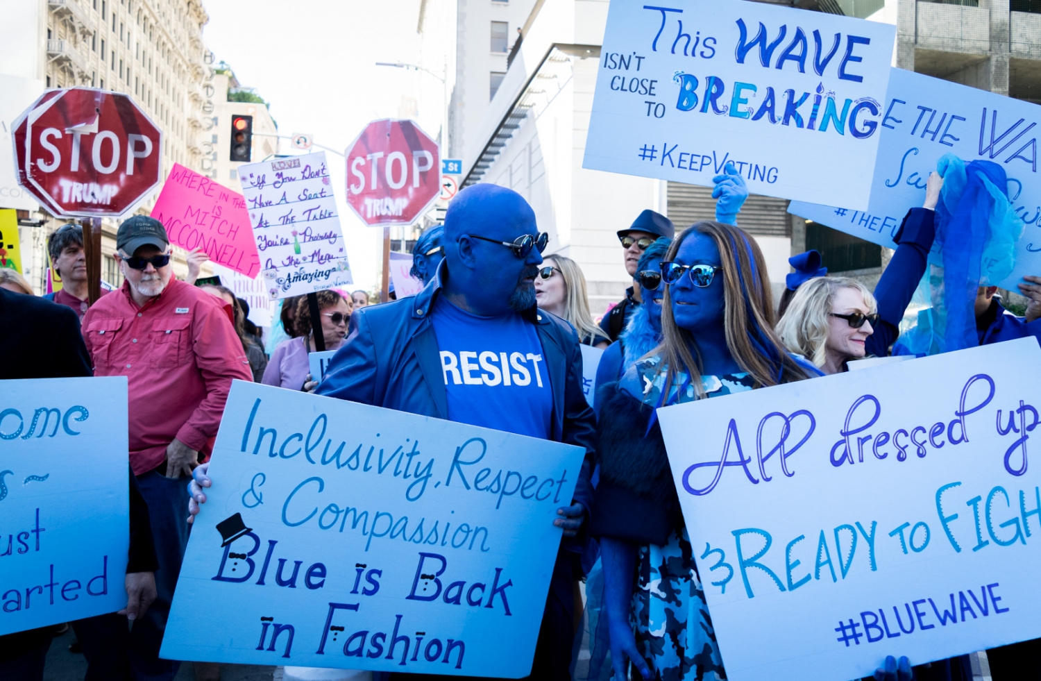 A family, dressed in all blue, marched to represent the ''blue wave'' and to encourage voters to show up at the polls.