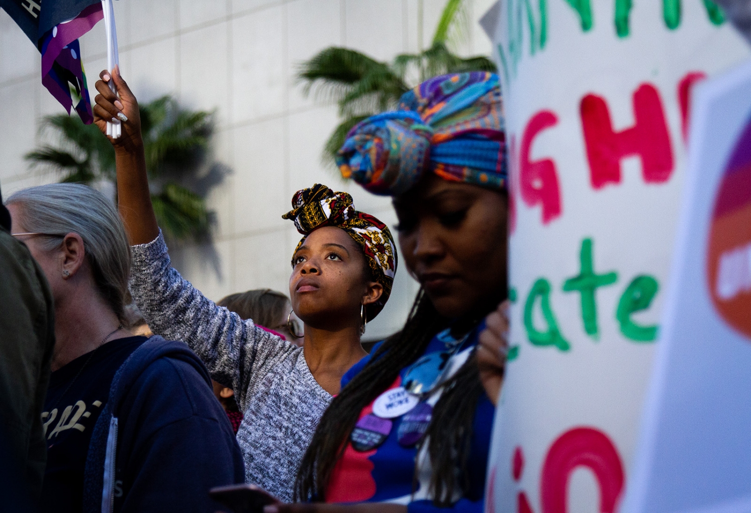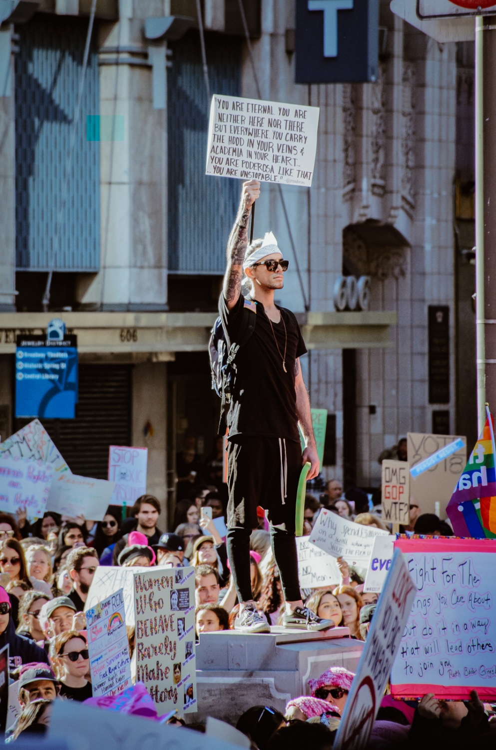 A demonstrator at the Women’s March 2019 stands atop a crowd of people present for the premarch rally in Pershing Square. The sign reads, ''You are eternal. You are neither here nor there, but everywhere. You carry the hood in your veins & academia in your heart. You are poderosa like that ... You are unstoppable,'' a quote from Huffington Post contributor Prisca Dorcas Mojica Rodriguez. Poderosa is the Spanish word for powerful.