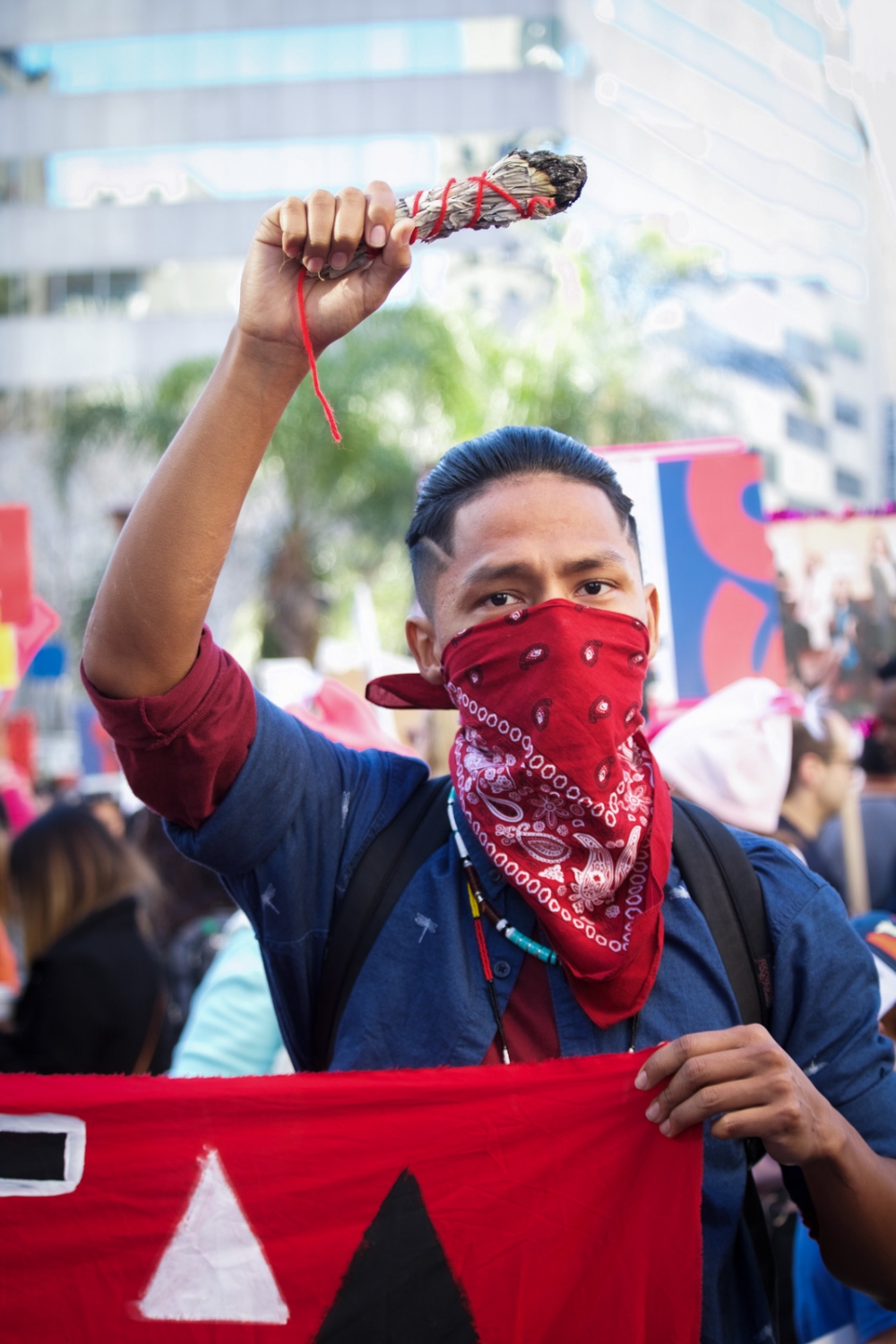 A student from Xinaxcalmecac Academia Semillas Del Pueblo, an Indigenous Mexican public charter school in LA Unified School District, carried burning sage as he marched.