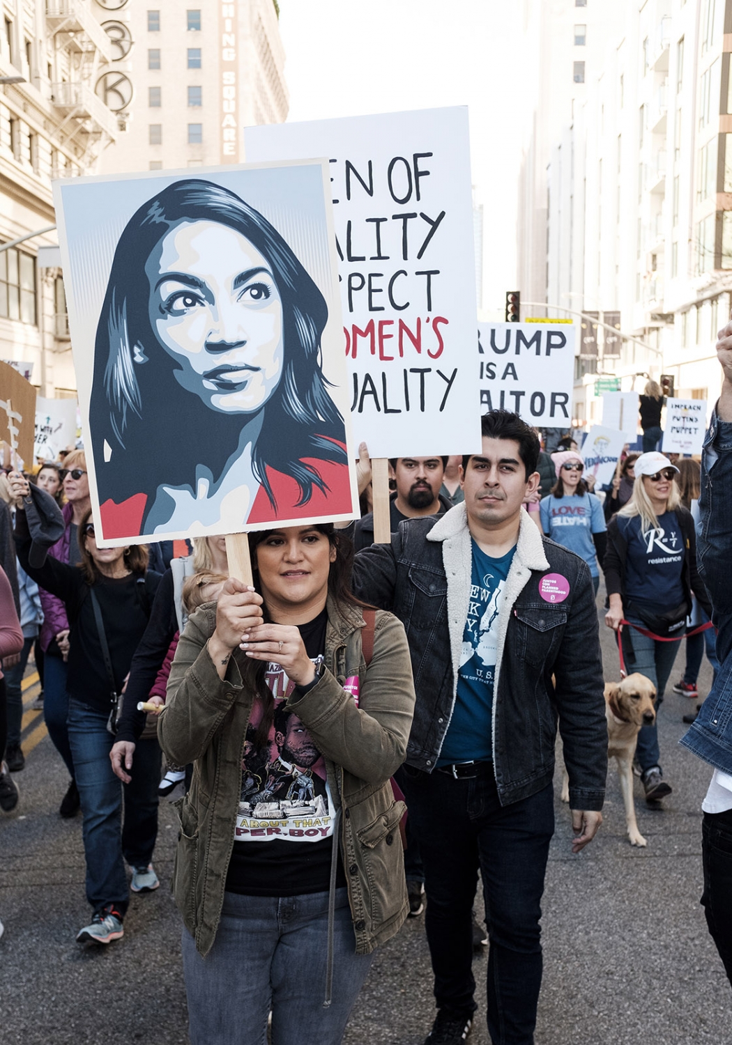 One marcher holds up a sign featuring U.S. Rep. Alexandria Ocasio-Cortez’s face. Many marchers’ signs featured names and faces of women newly elected to Congress.