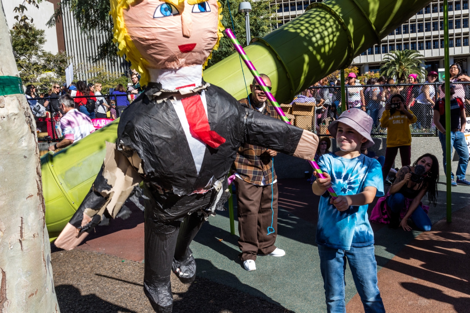 Wiley Parker, 10, takes a swing at a pinata shaped like President Donald Trump in a playground inside Grand Park. A couple other children also beat the pinata after Parker's turn.