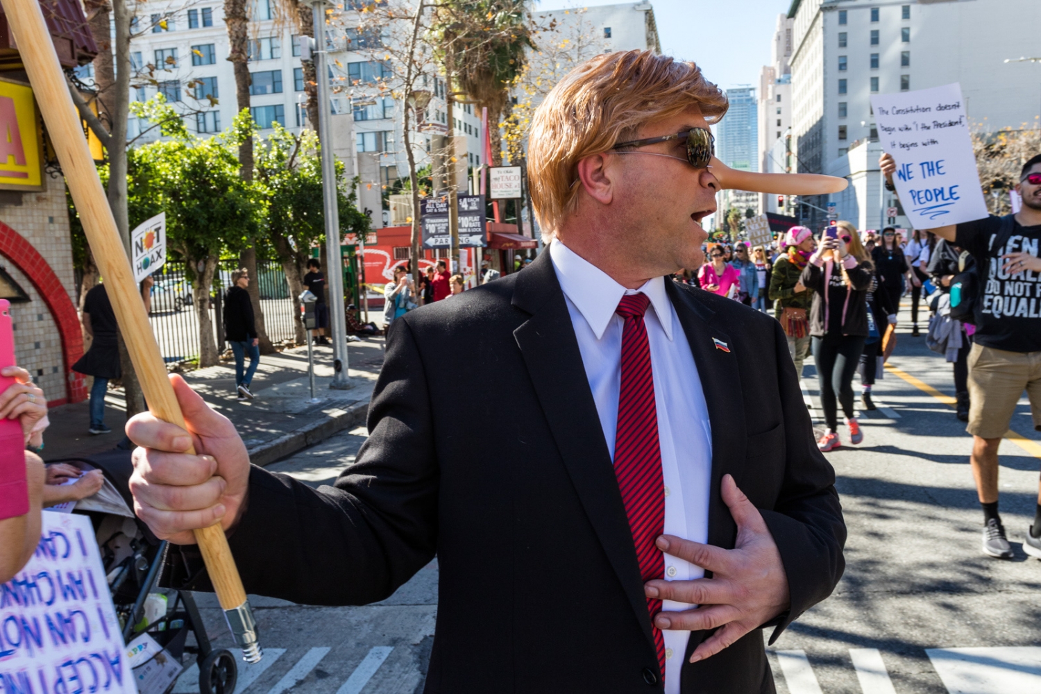''Trust me, my guts are smarter than anybody's brain,'' a Donald Trump impersonator with a Pinocchio nose told the protesters.