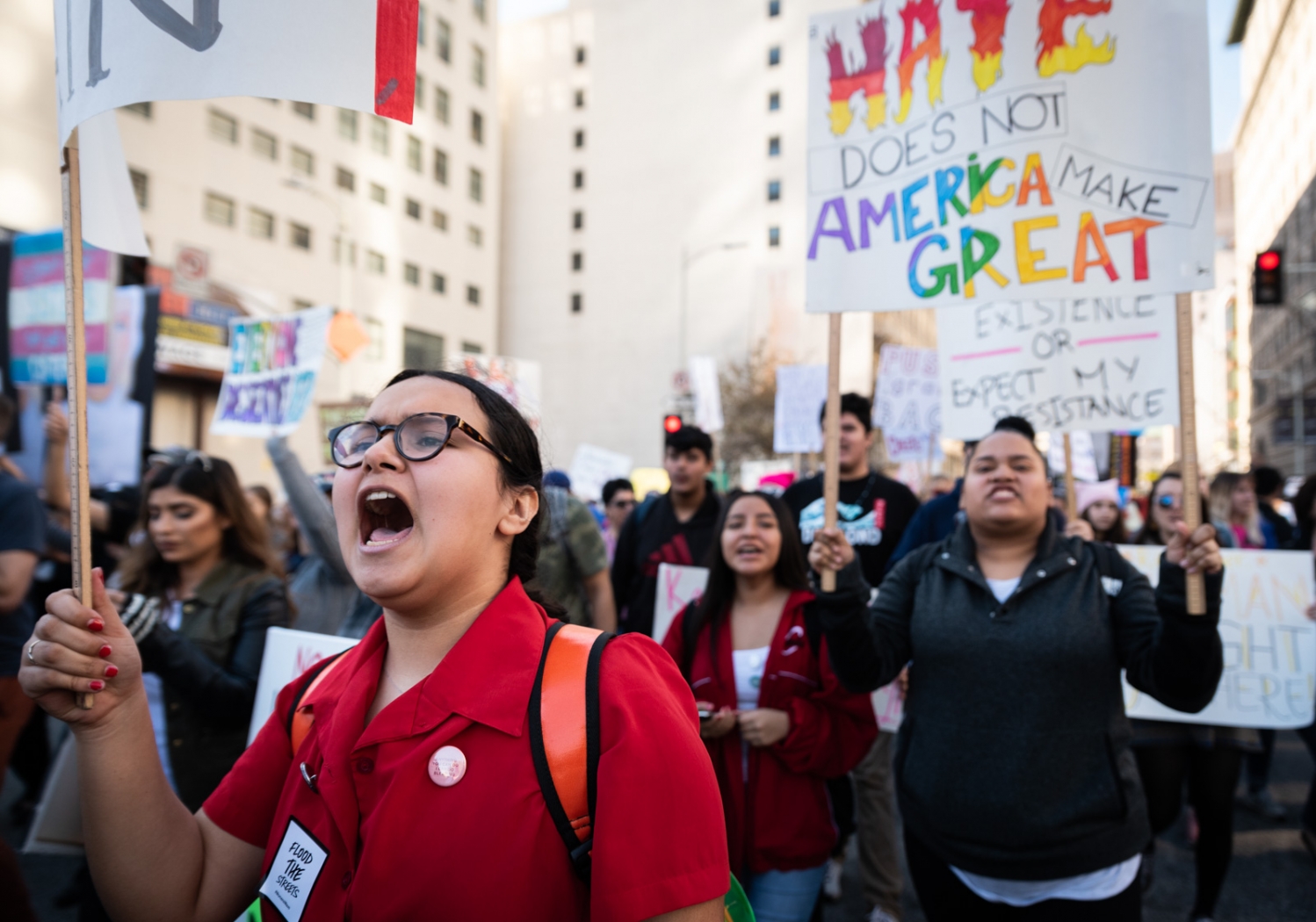 LAUSD student Esmeralda Landa holds a sign above the marching crowd at her first Women's March.