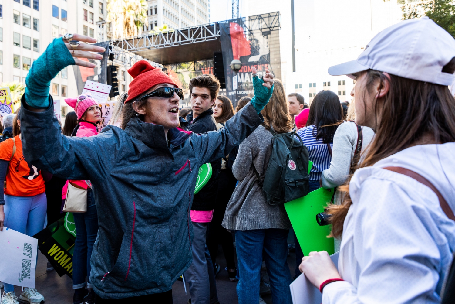 A man disrupts demonstrators during the march's opening ceremonies, swearing and urging those around him to resist white feminism before being escorted away from the crowd.