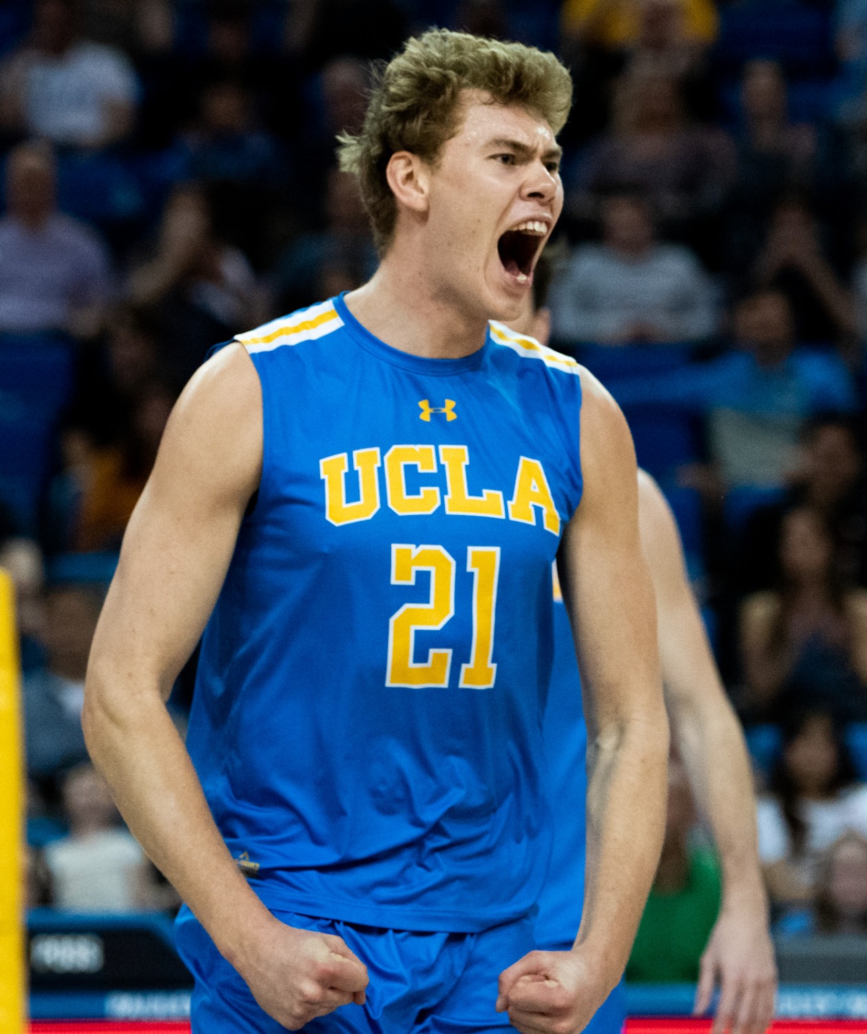 Freshman setter Kyed Jensen celebrates after the Bruins won a set.