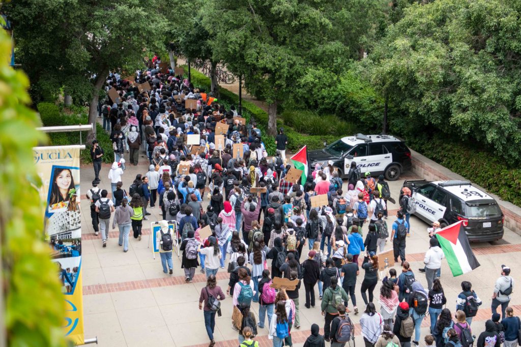 Hosted by campus organizations including Students for Justice in Palestine and the UC Divest Coalition at UCLA, the event began at 4:30 p.m. with speeches and included a march to the UCPD station on Westwood Boulevard. The group then went to Royce Hall at around 6:30 p.m., ending the event with the announcement of the United Auto Workers Local 4811 union’s authorization of a strike.
