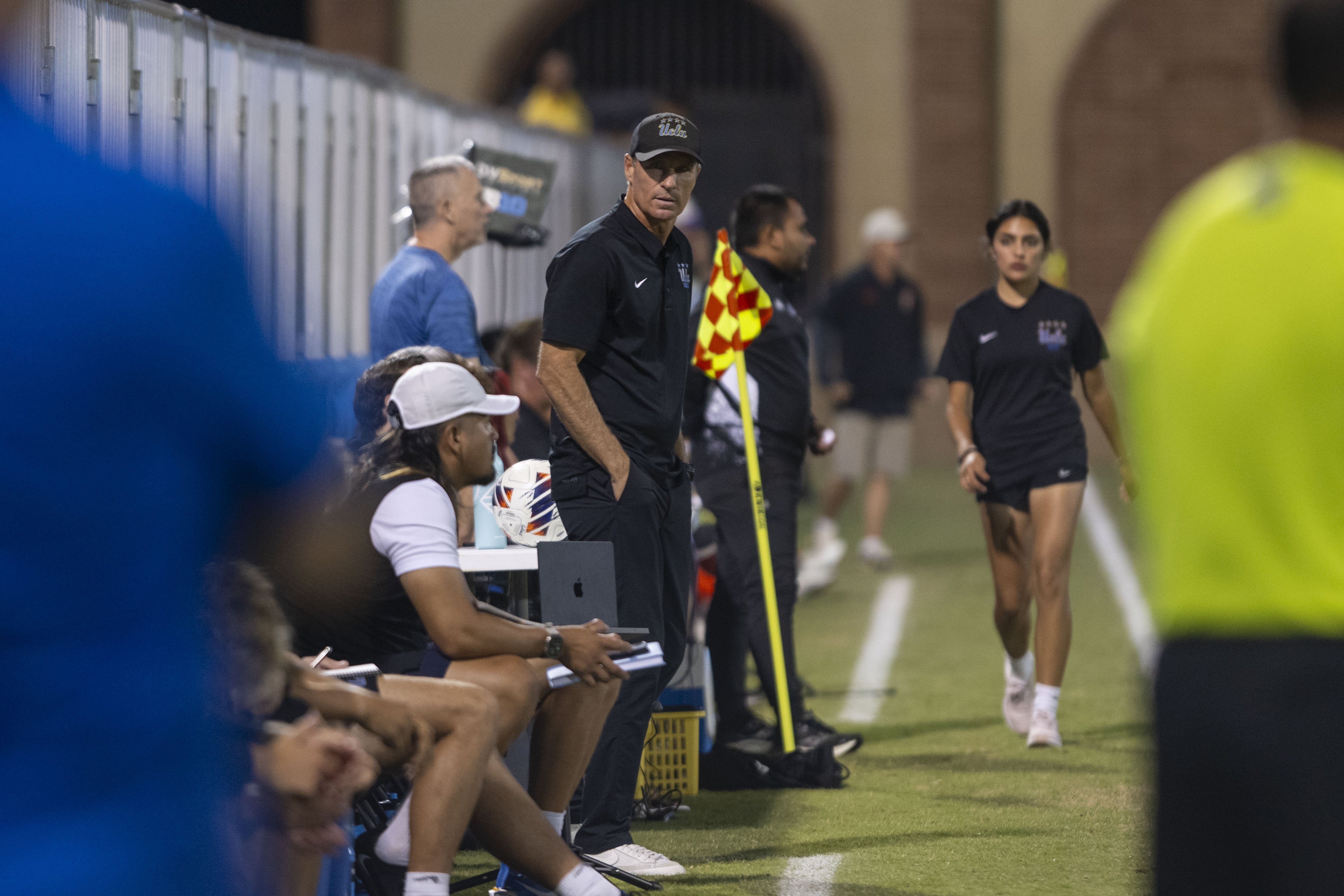 Coach Ryan Jorden stands on the sidelines during a UCLA men’s soccer game at Wallis Annenberg Stadium. (Darlene Sanzon/Daily Bruin senior staff)